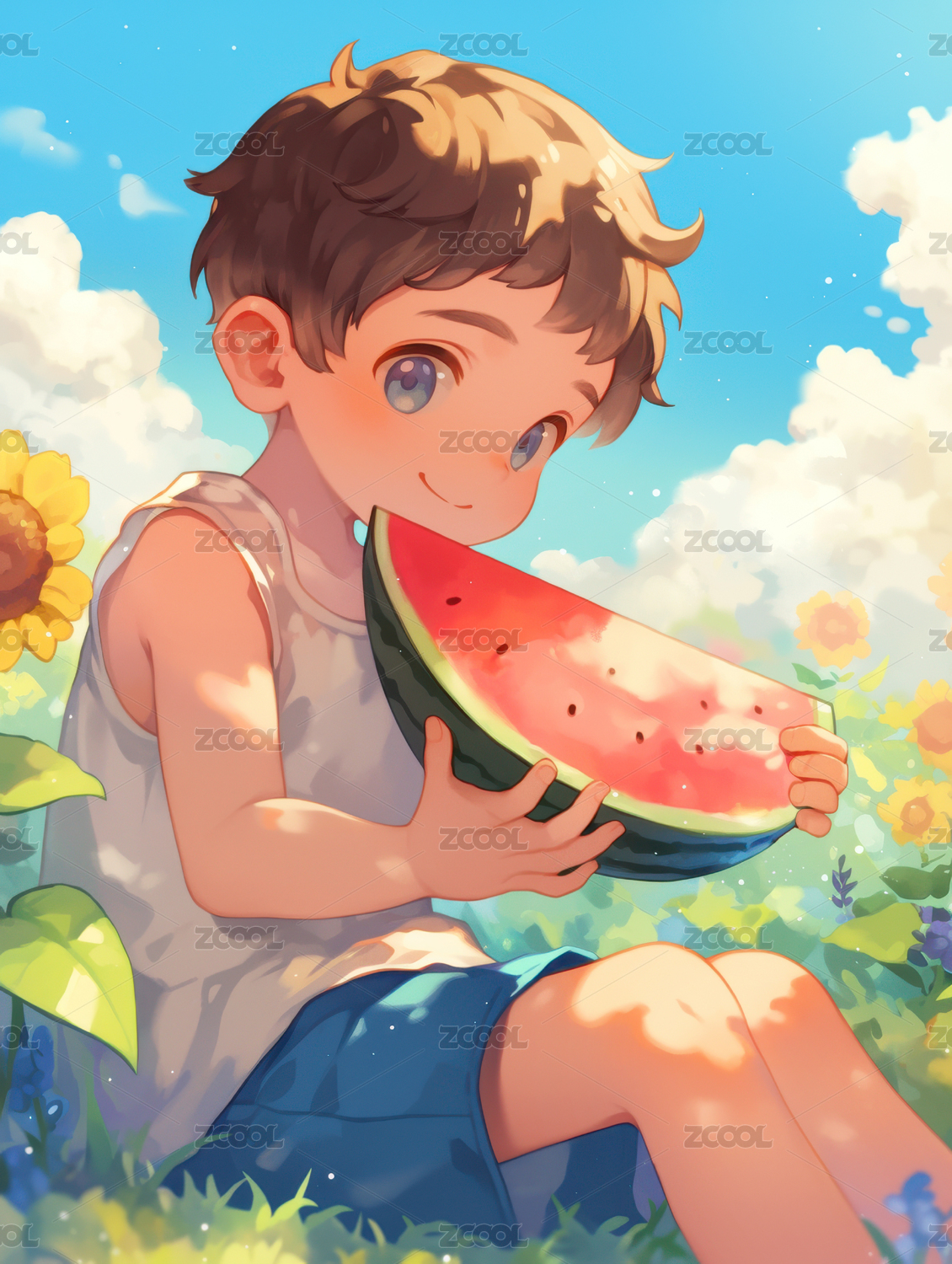 夏日吃西瓜的孩子插画