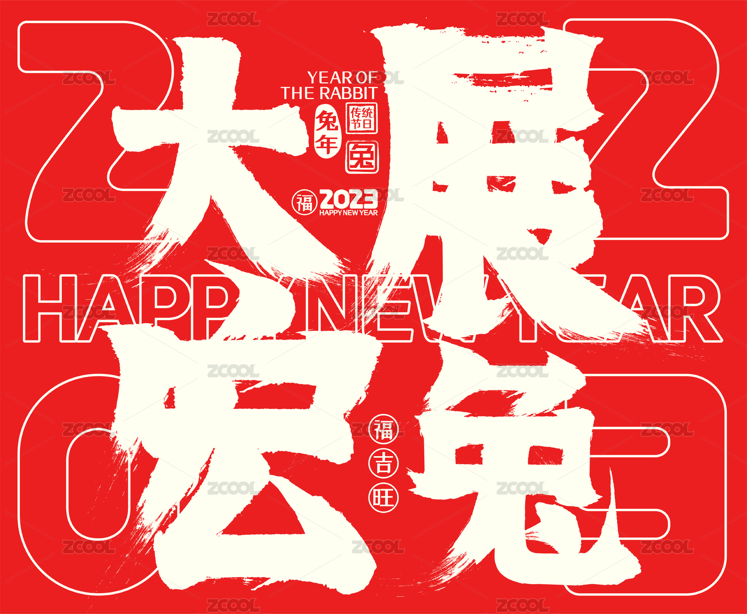 2023大展宏兔喜庆中国红兔年春节毛笔字