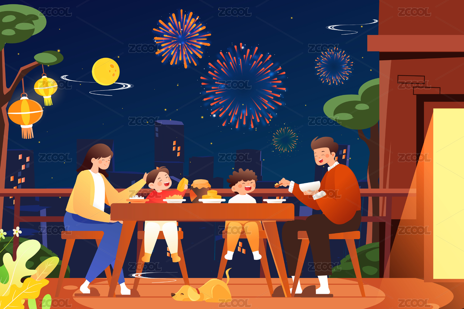 中秋节的夜晚一家人欢乐的吃饭赏月 夜晚月亮背景和家人一起吃月饼插画