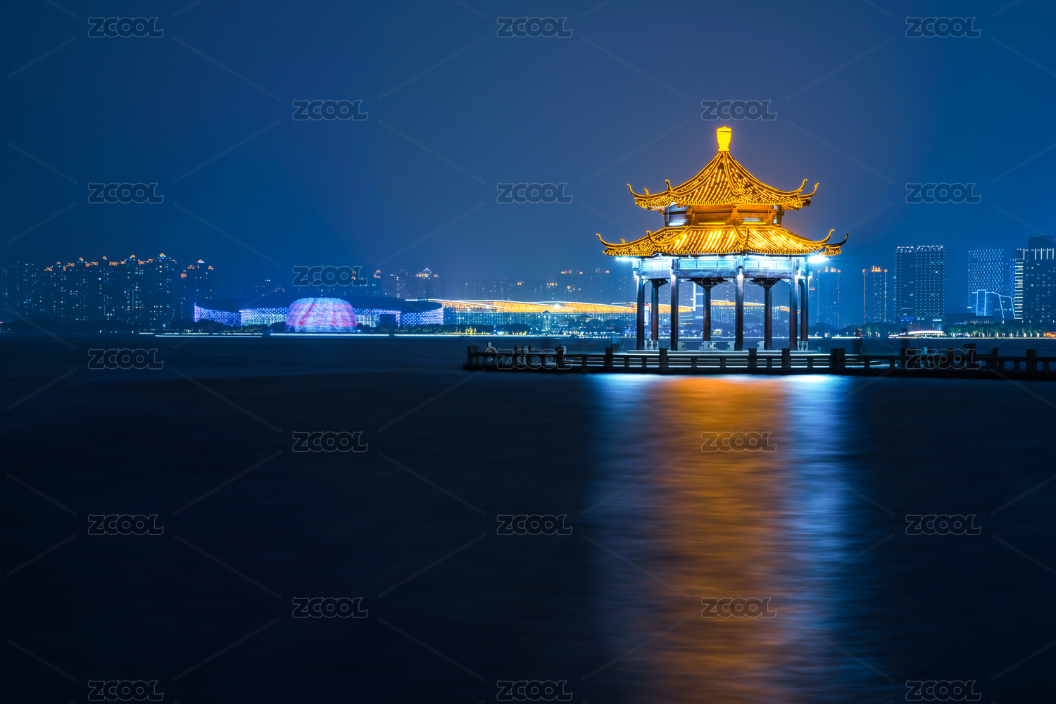 中国江苏苏州金鸡湖湖心亭夜景风光