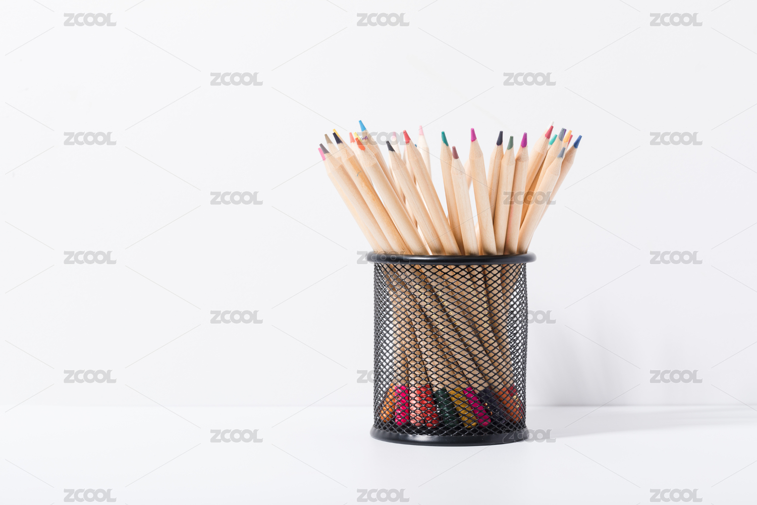 松木纹桌面上黑笔筒里的十二色彩色铅笔