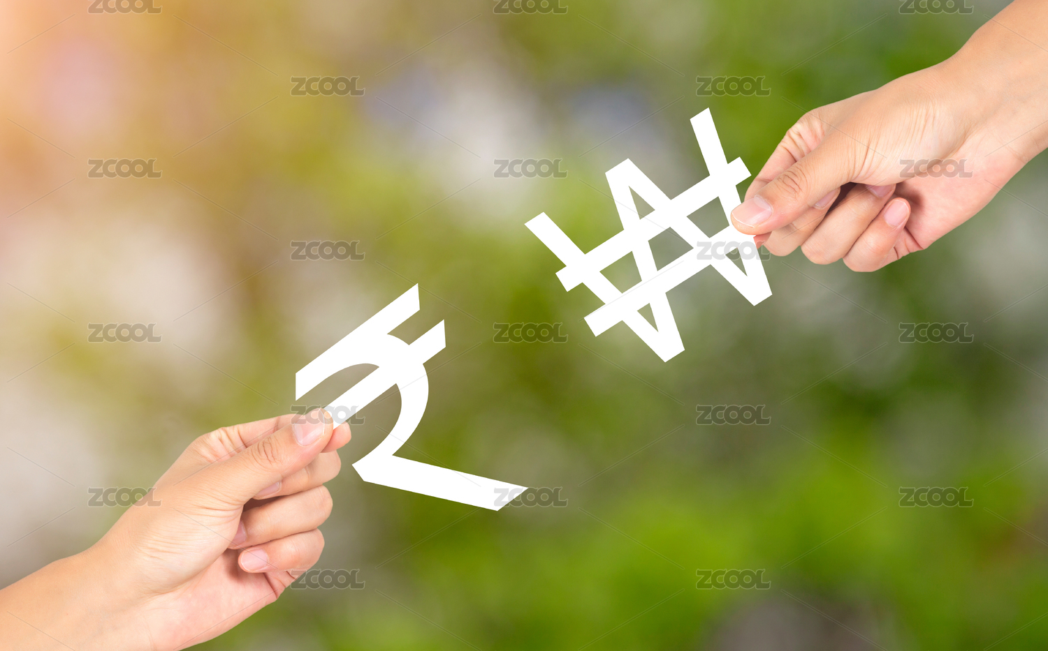 手拿印度货币卢比符号和另一只手拿韩国货币韩元符号争锋相对