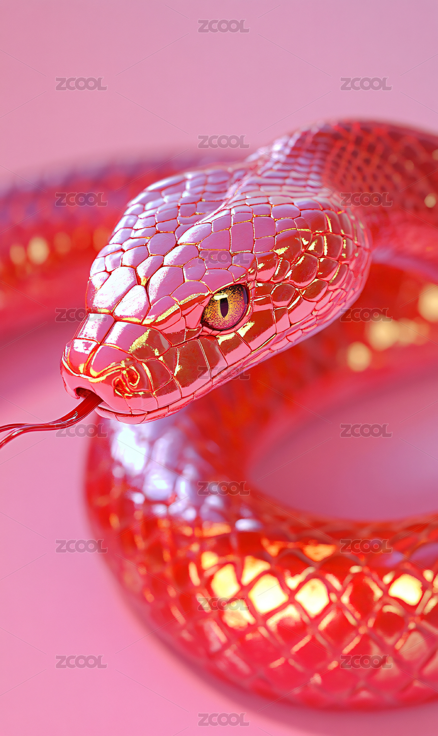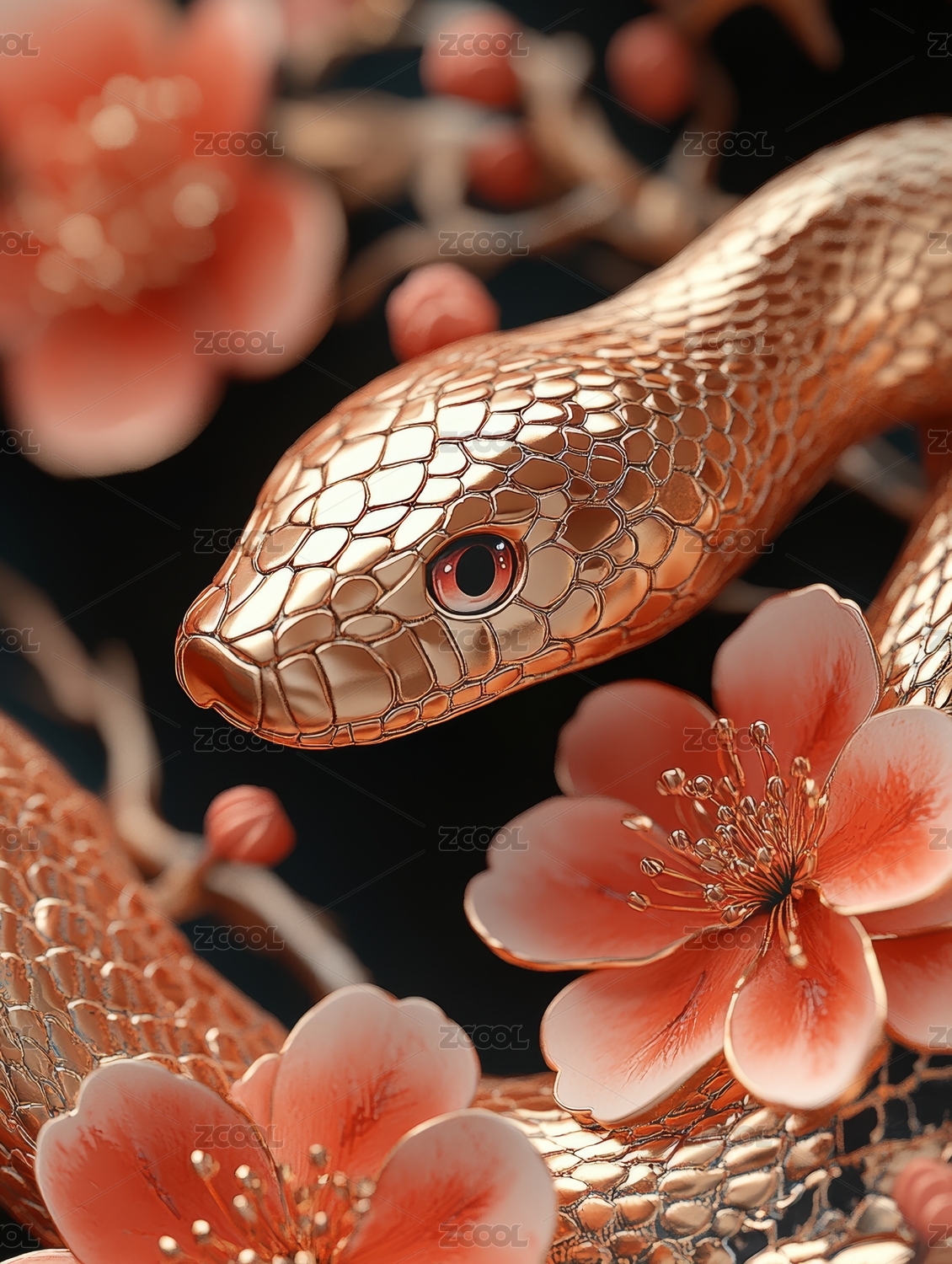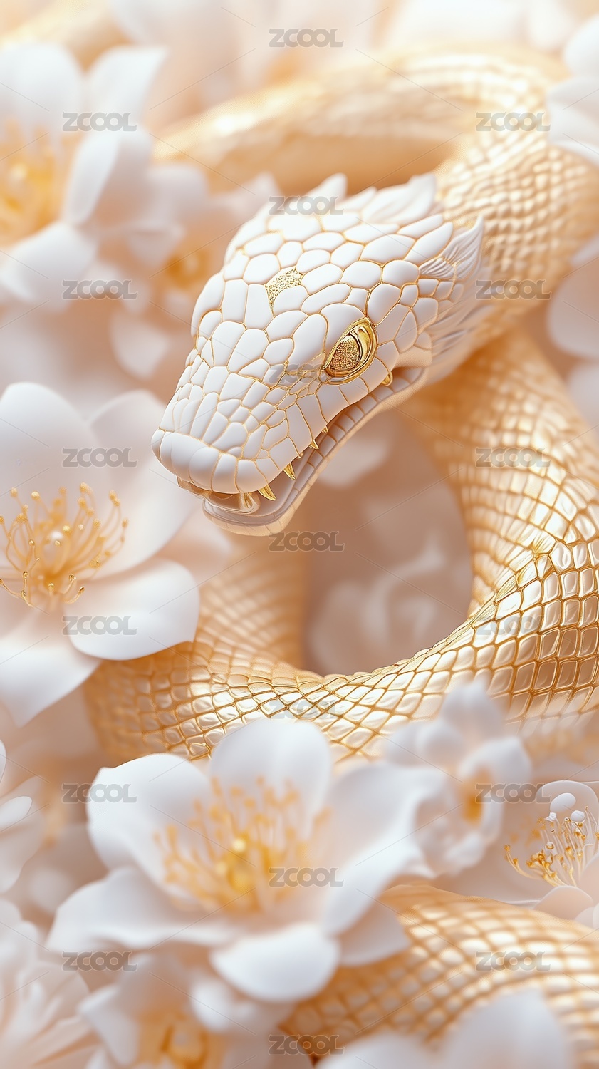 清新明亮户外花丛中金色属相蛇3D立体插画