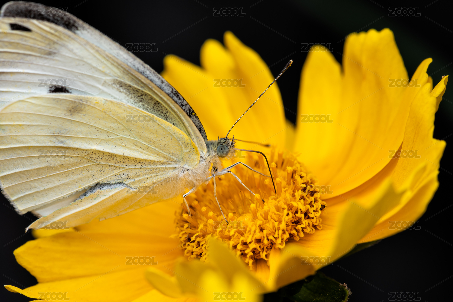黄色花朵上采蜜的蝴蝶特写