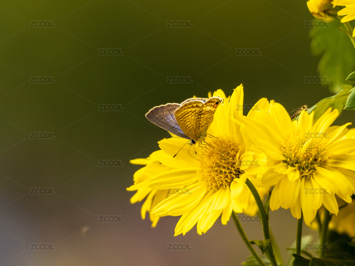 一只蝴蝶(曲纹紫灰蝶)在黄色野菊花上采蜜