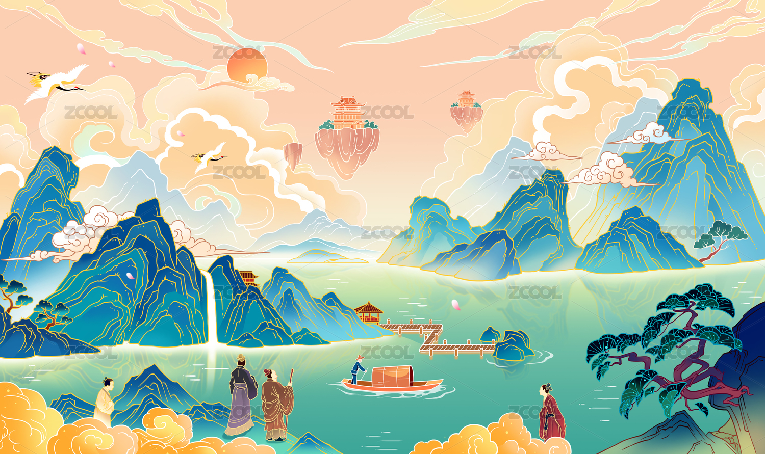 国潮插画风格山水风景插画