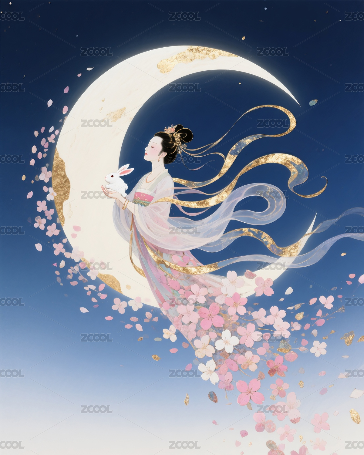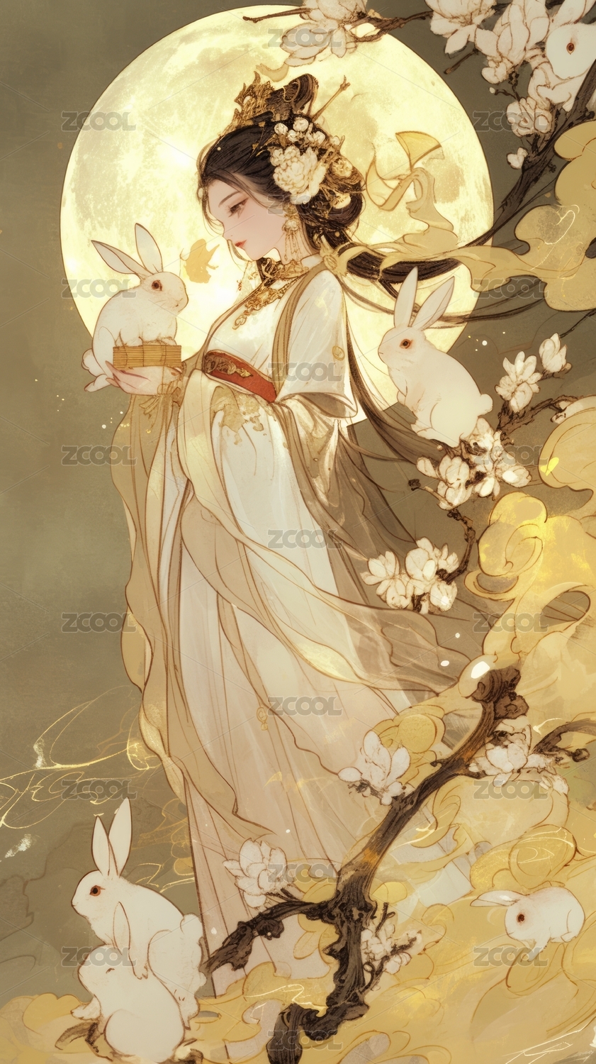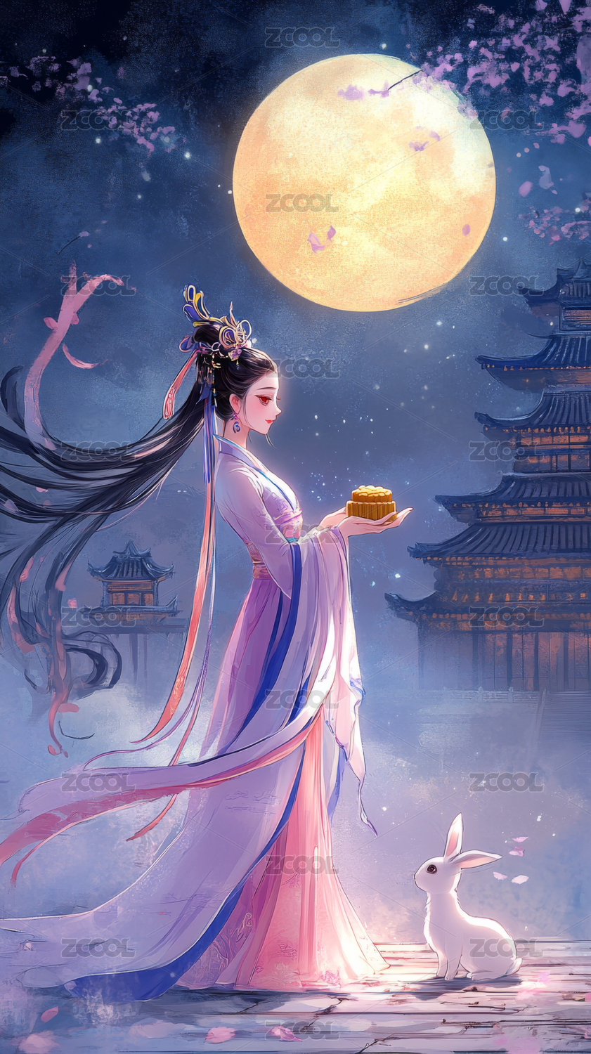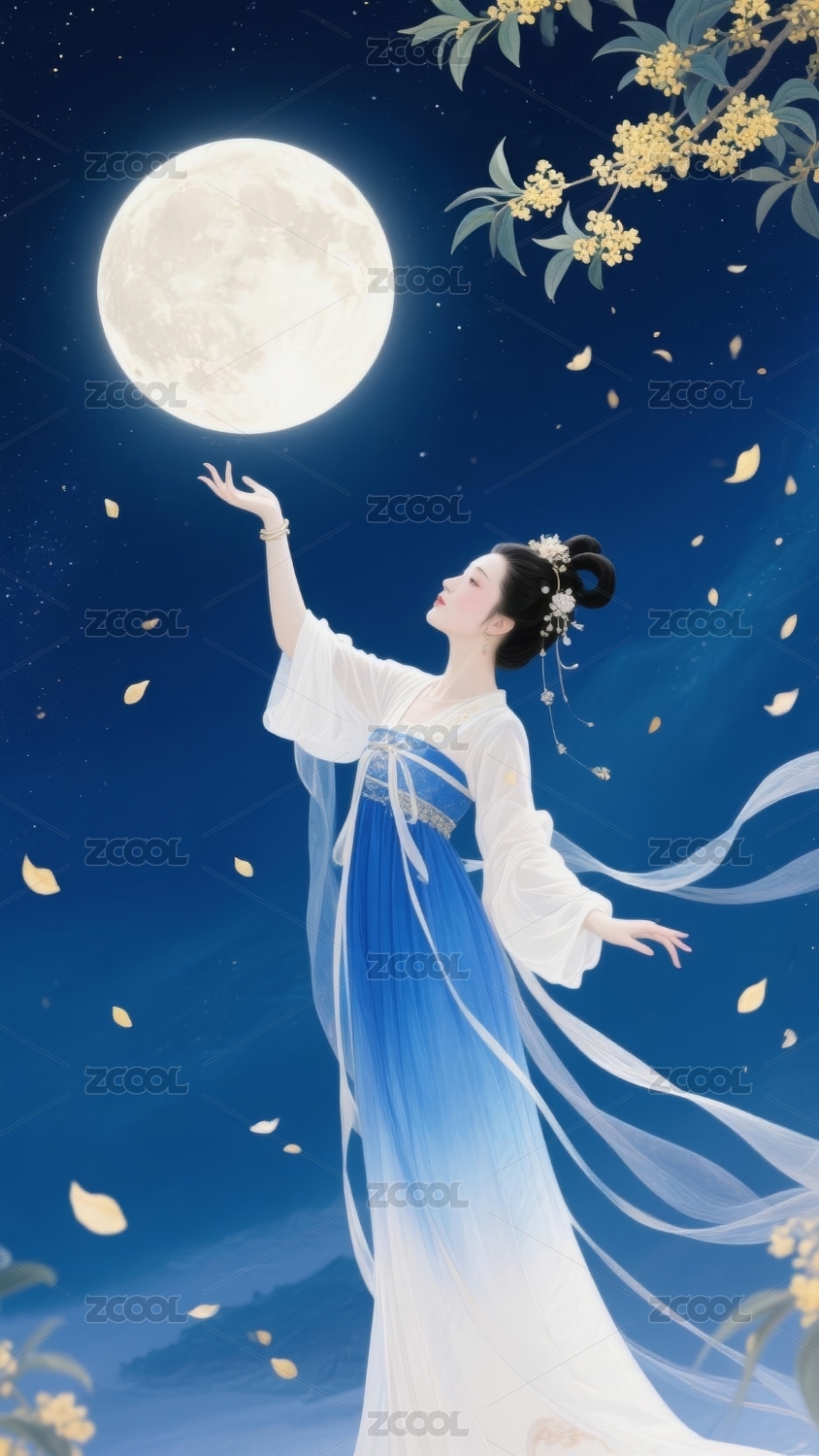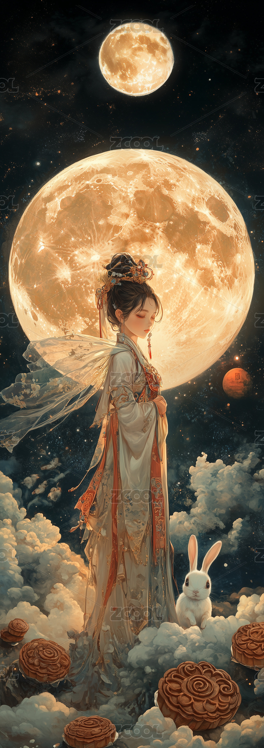 中秋节满月背景下的嫦娥与玉兔