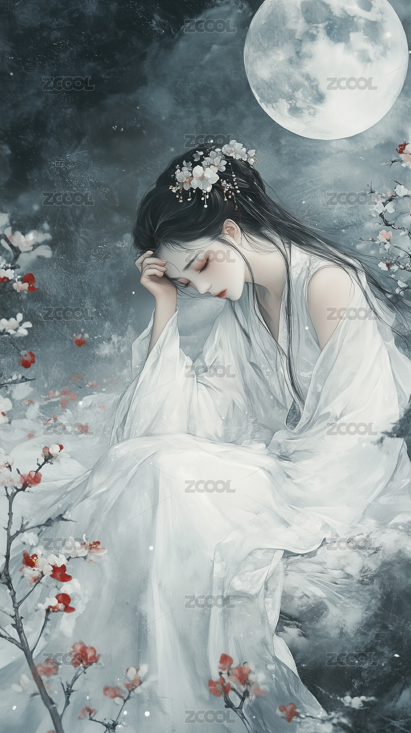 月下花枝上的古典美人
