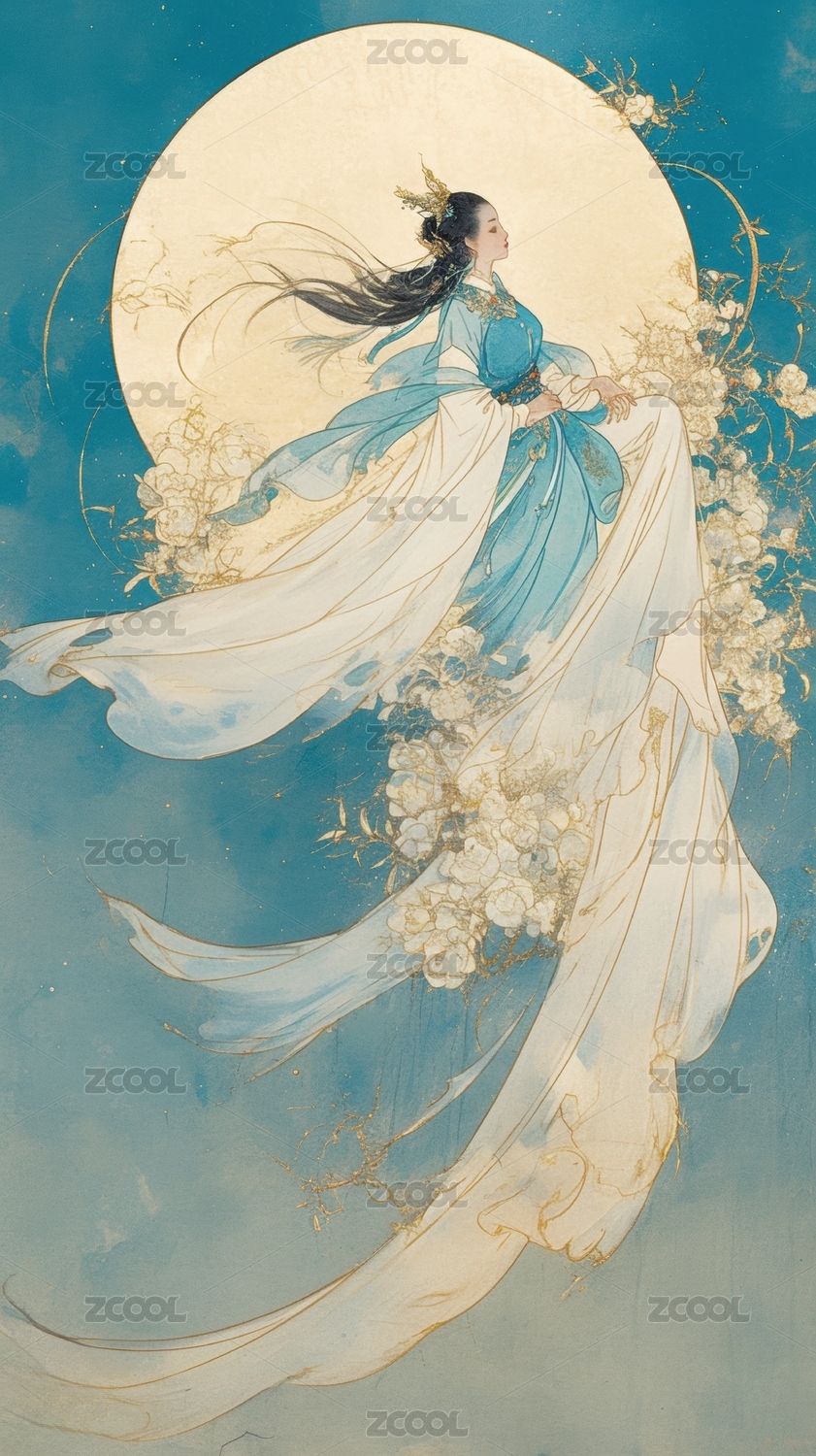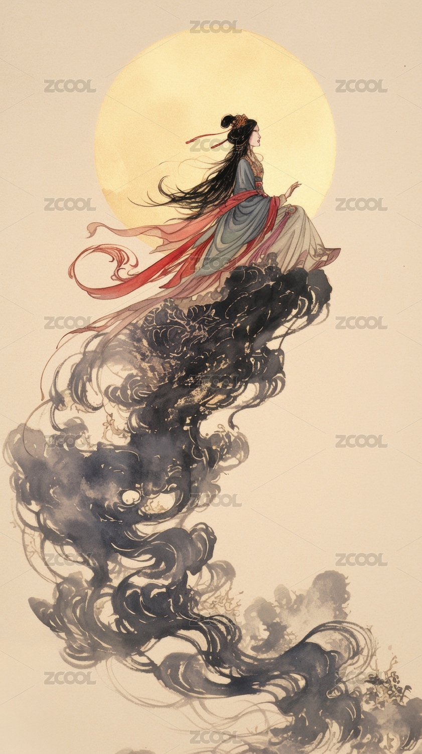 中国风,嫦娥,奔月,月亮,神话,水墨画,插画,AIGC202403