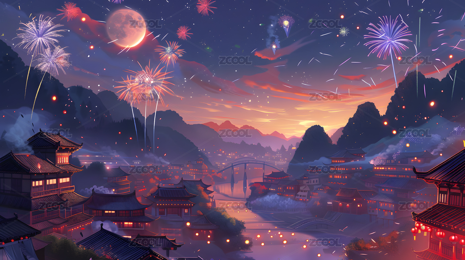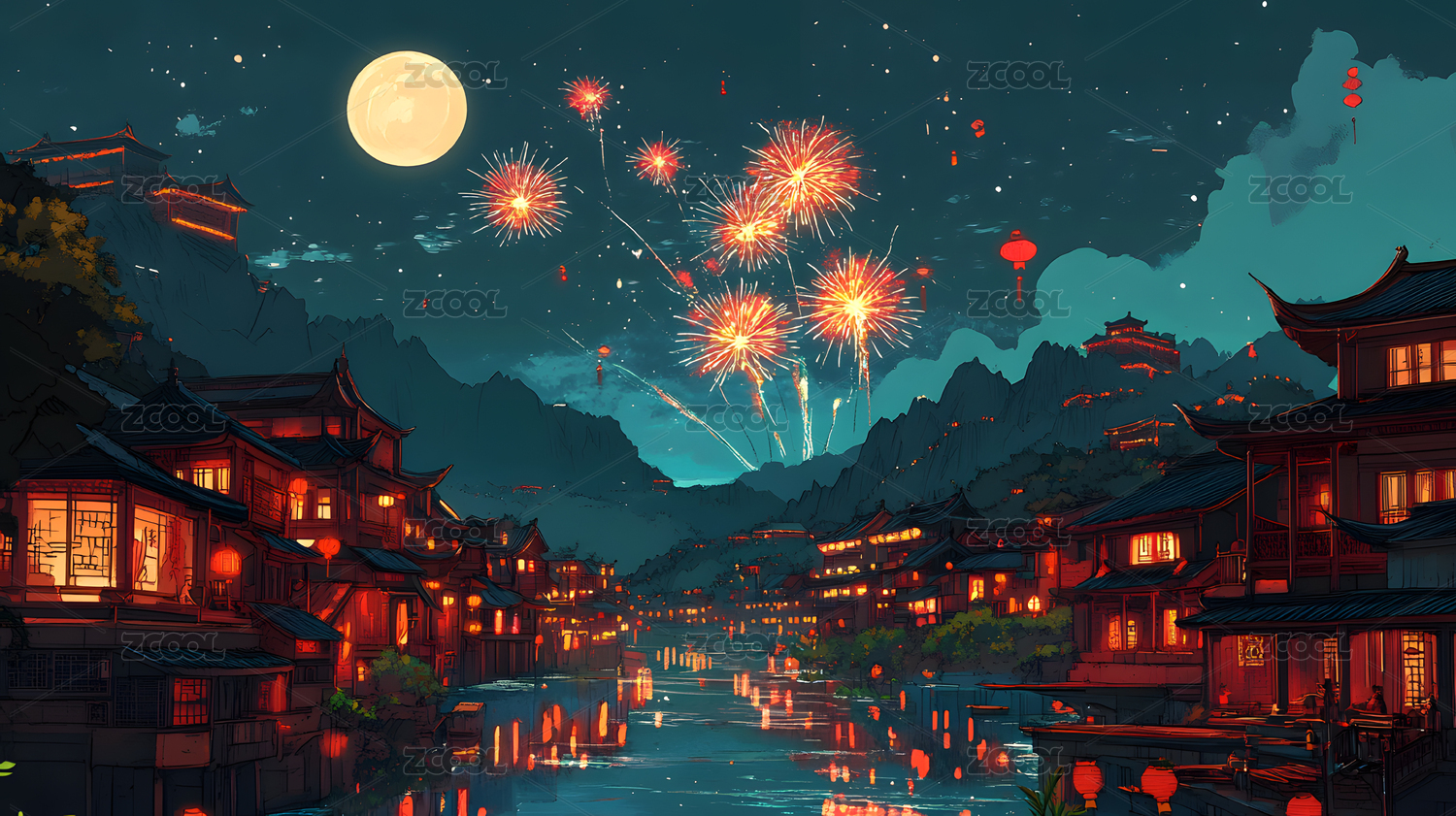 国潮风,春节,节日,古镇,建筑,天空,烟花,插画