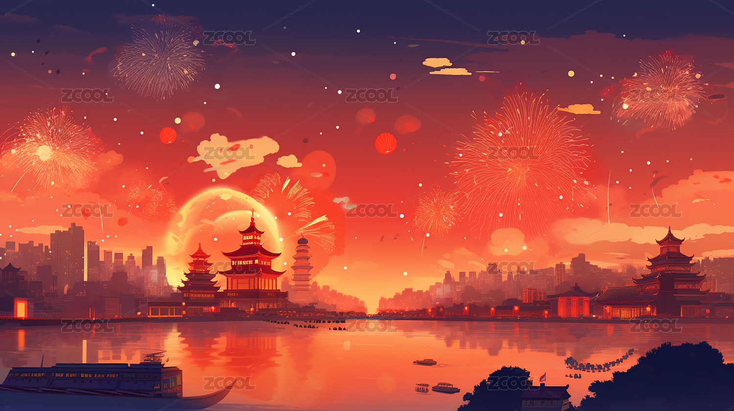 烟花国庆节春节新年中秋节节日卡通插画背景