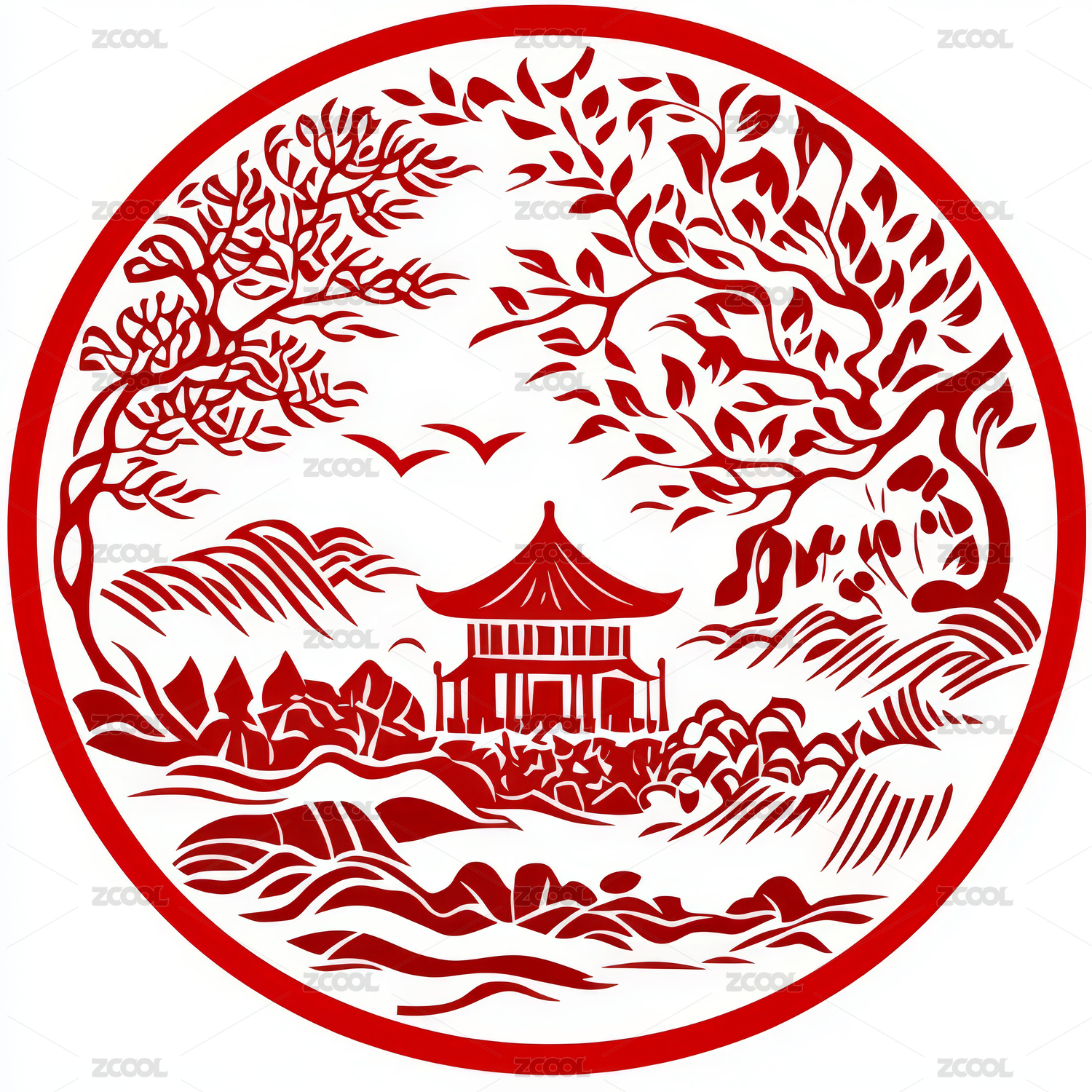 红色山水图案剪纸