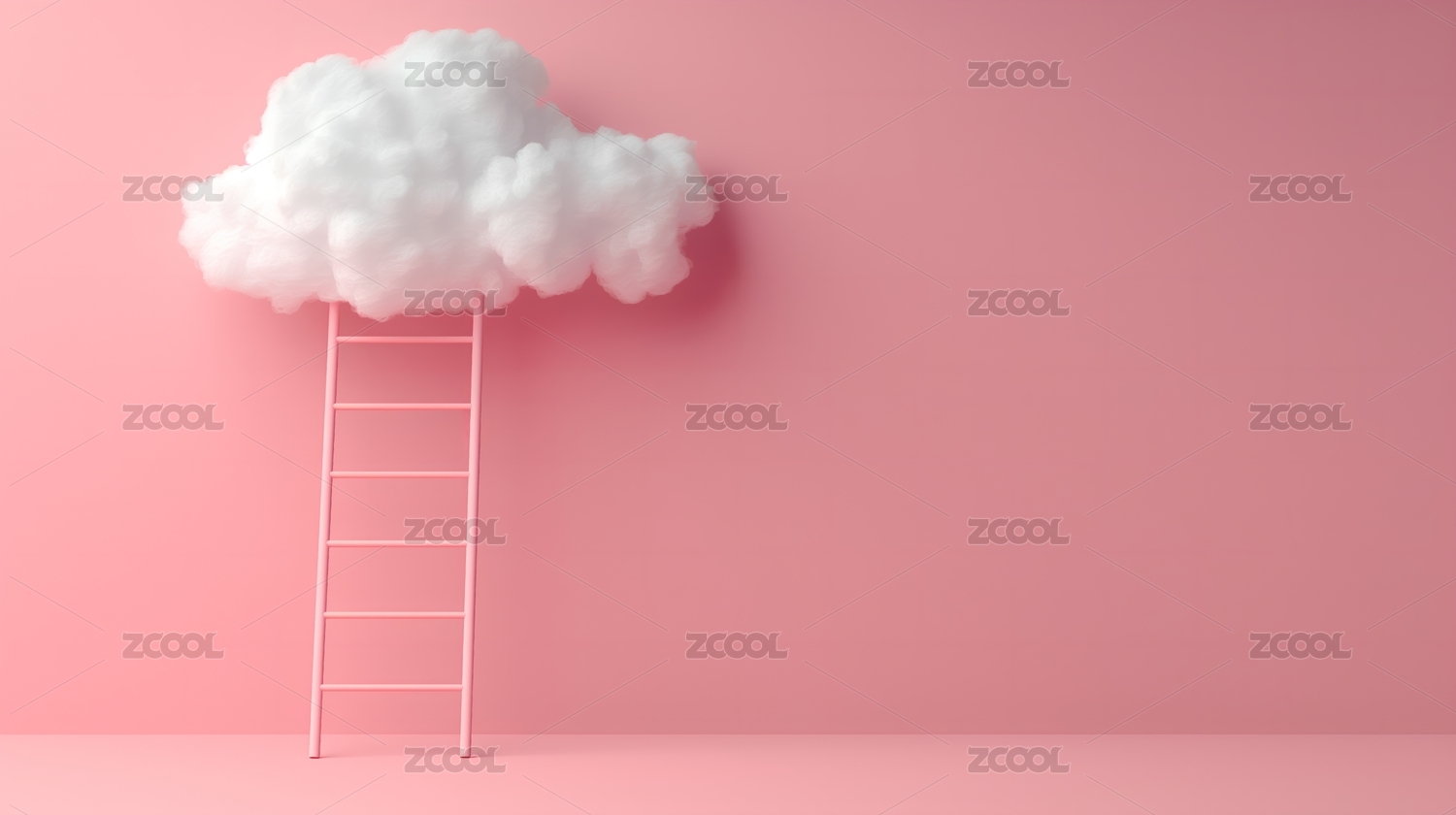 极简淡粉色背景幻想中通往一小朵白云的梯子