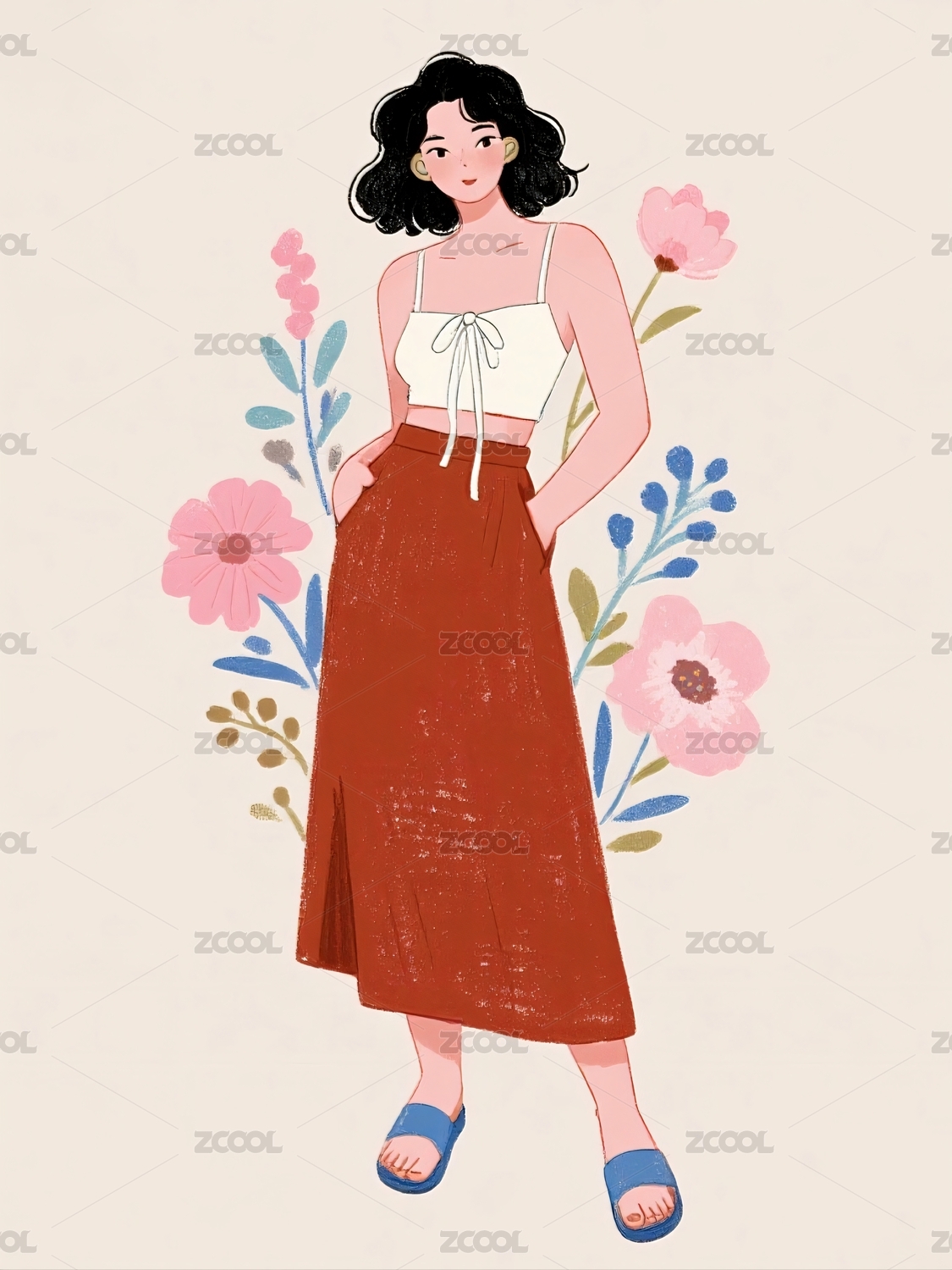 手拿插着植物花瓶的长发红裙少女 水彩手绘