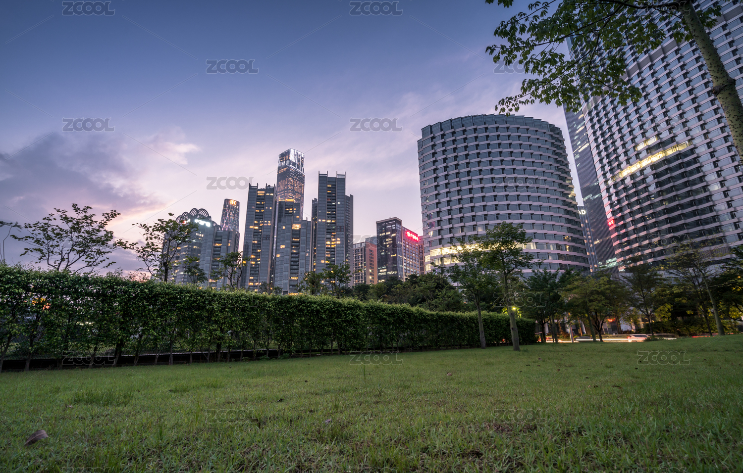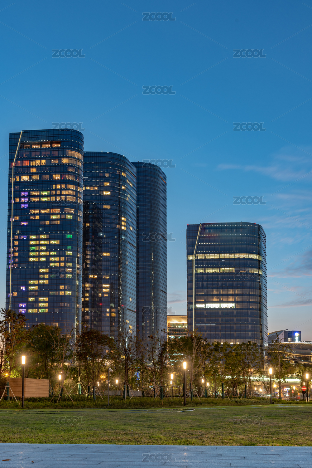 草坪绿地与商务楼夜景,中国上海市大宁郁金香公园