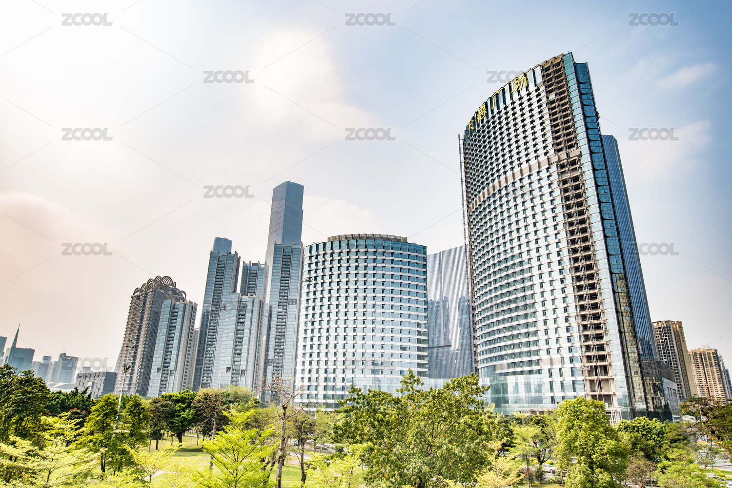 仰视深圳现代建筑办公楼和城市广场街道景观