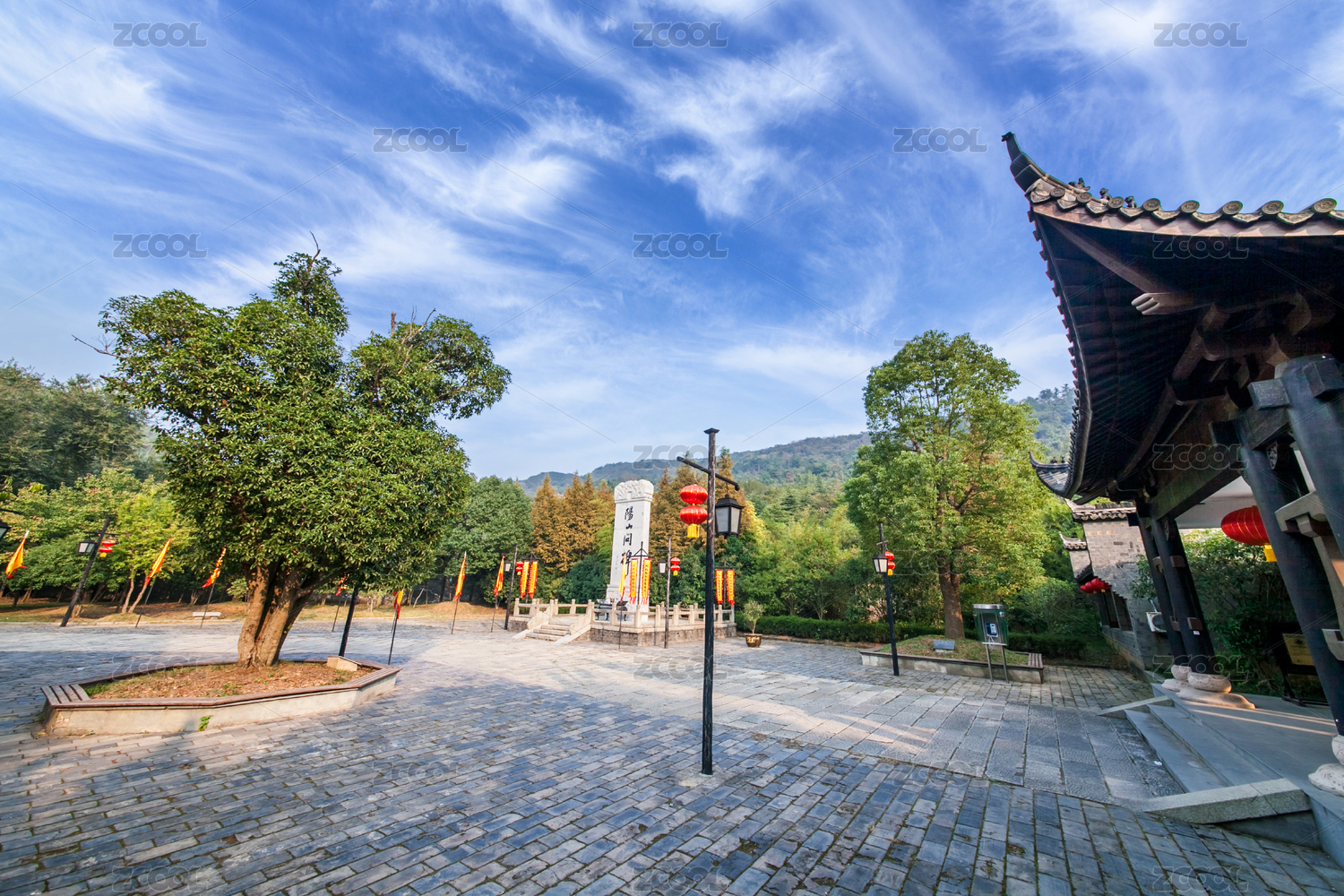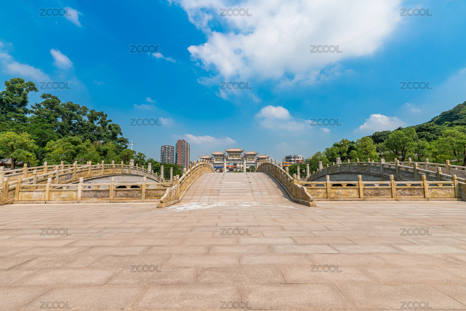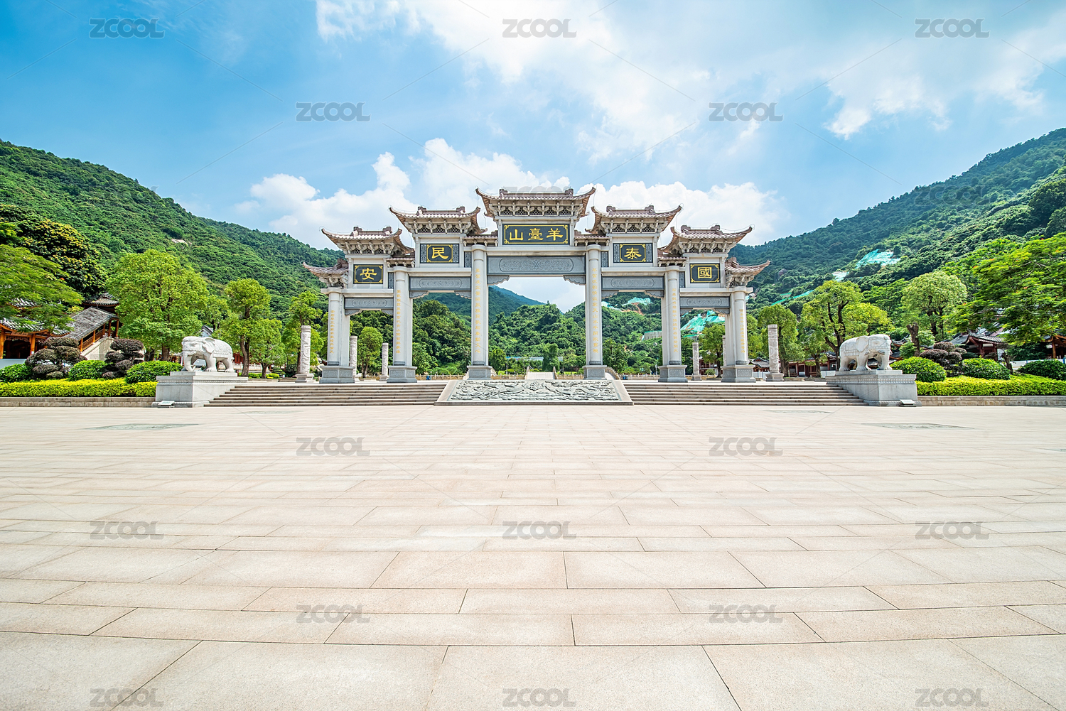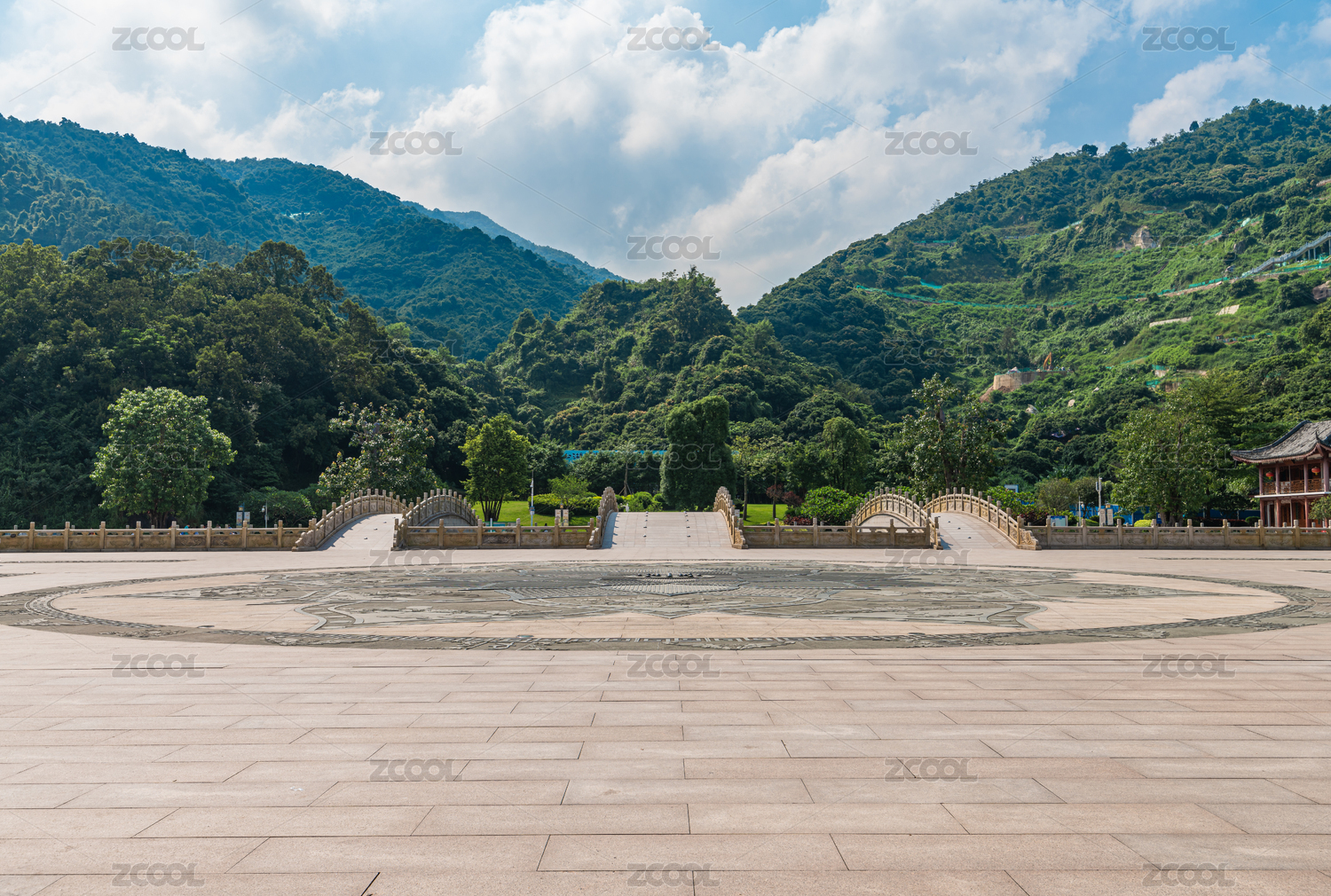 中国山东省临沂市云蒙山上带有佛教雕塑的观景平台