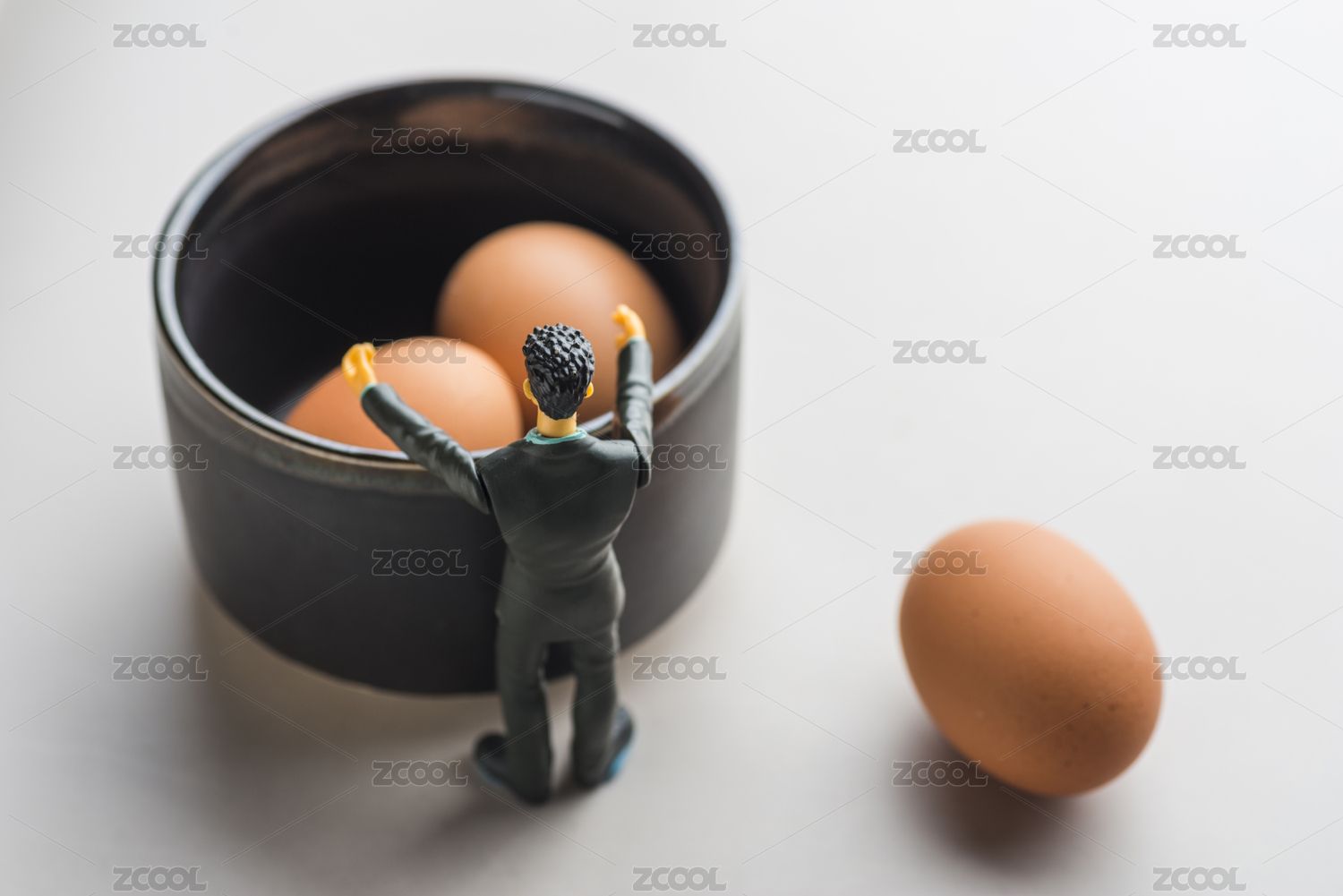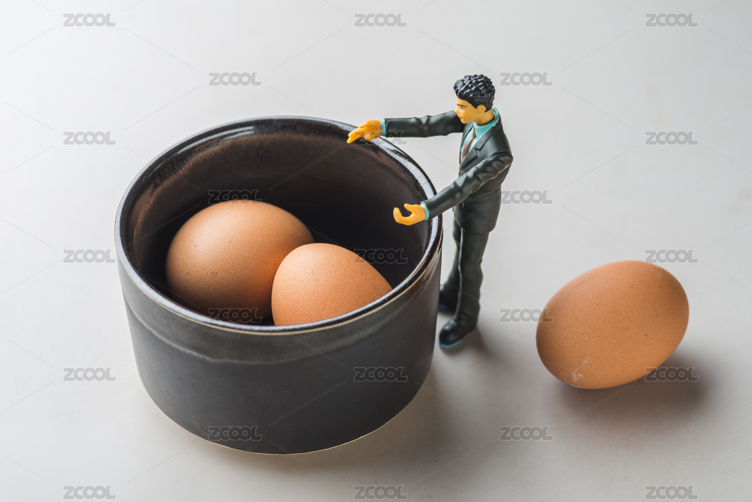 青年男子模型站在装有鸡蛋的陶碗前