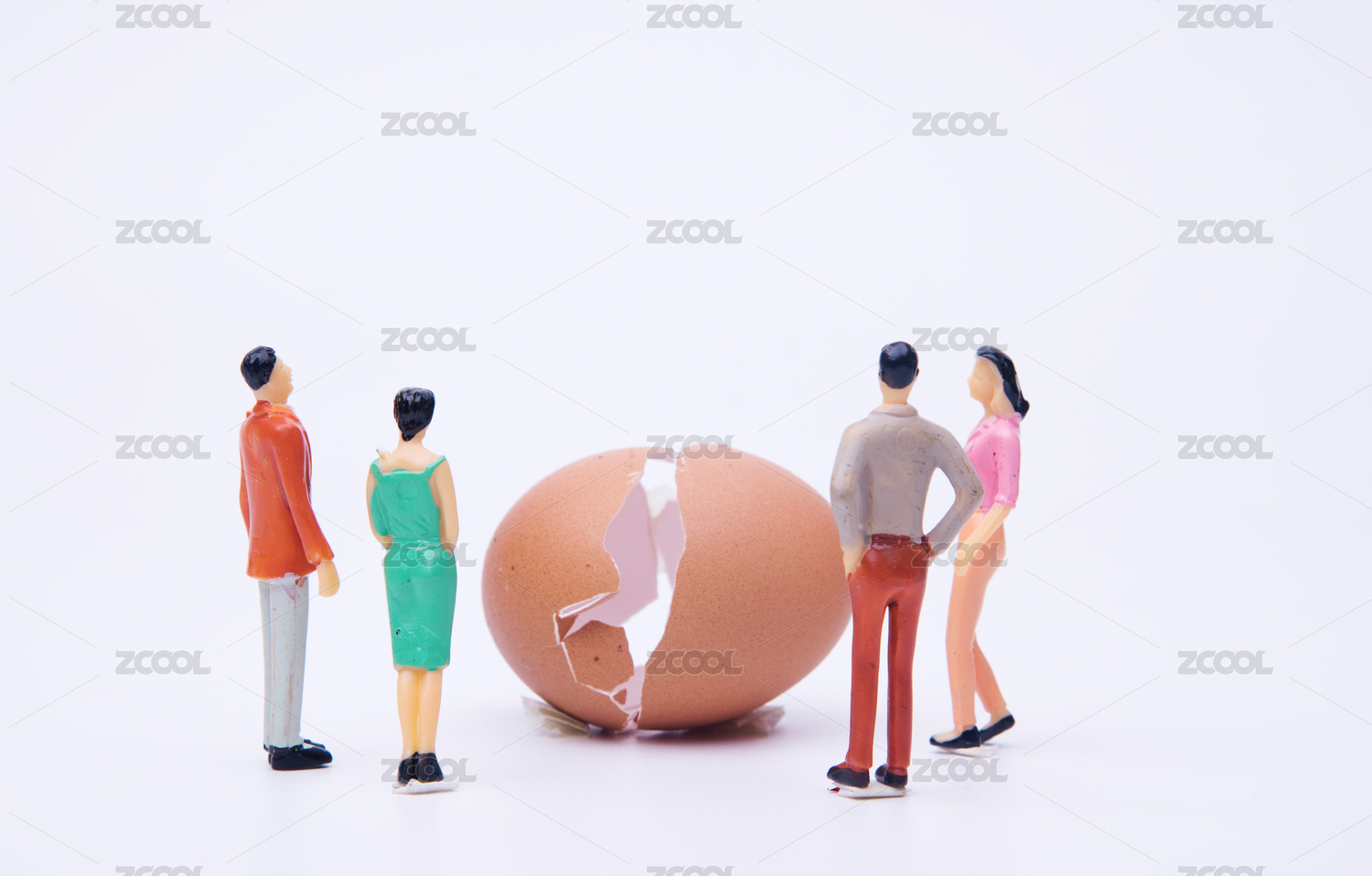 白色背景中彩色的小人和碎裂的蛋壳