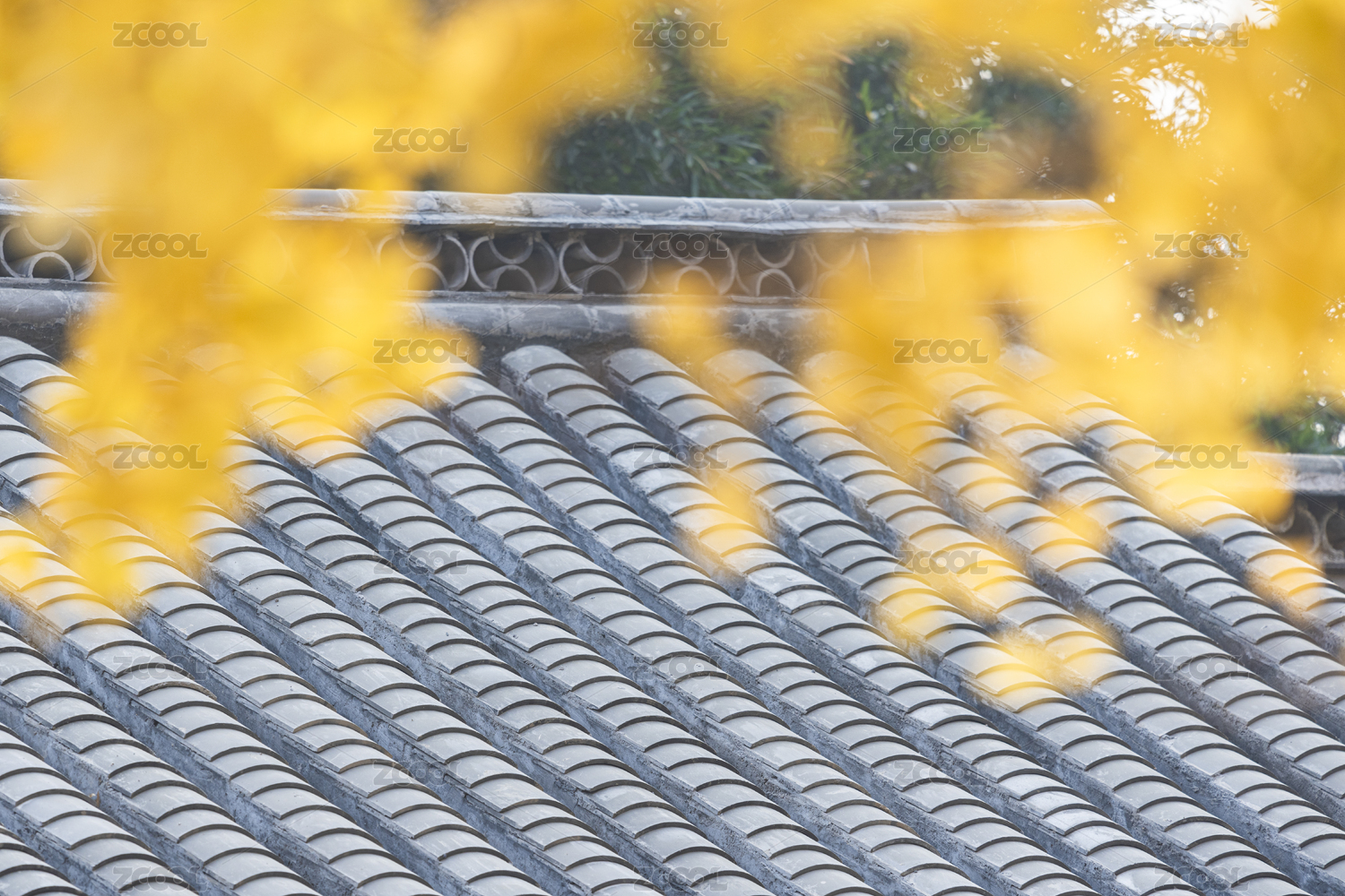 江苏扬州史公祠秋天屋顶的银杏黄叶