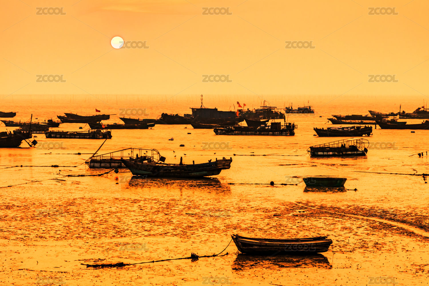 日出福建霞浦三沙镇海湾港口停靠的渔船