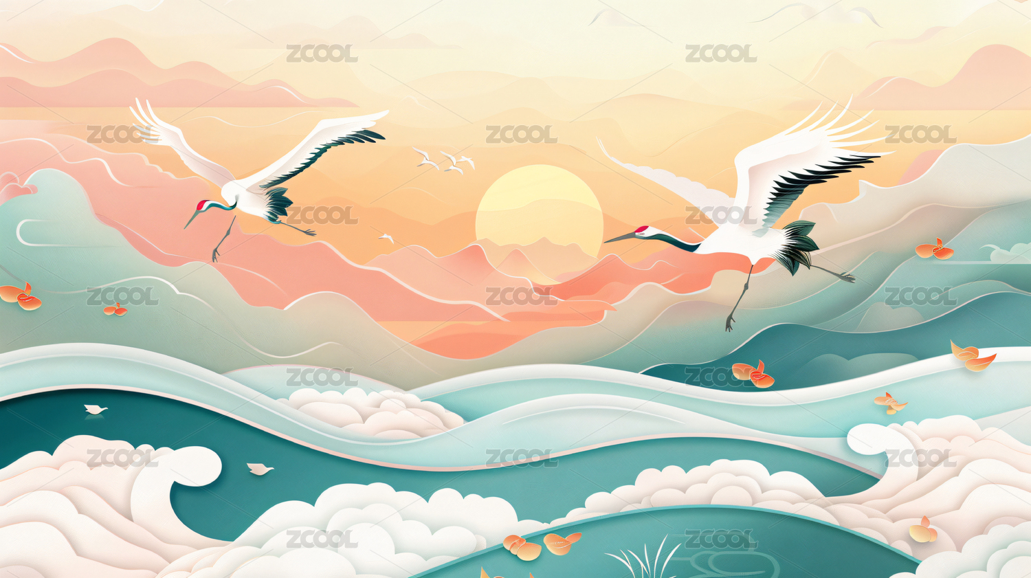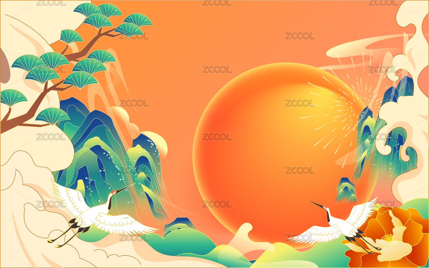 国潮节日喜庆中国风青绿山水背景矢量插画