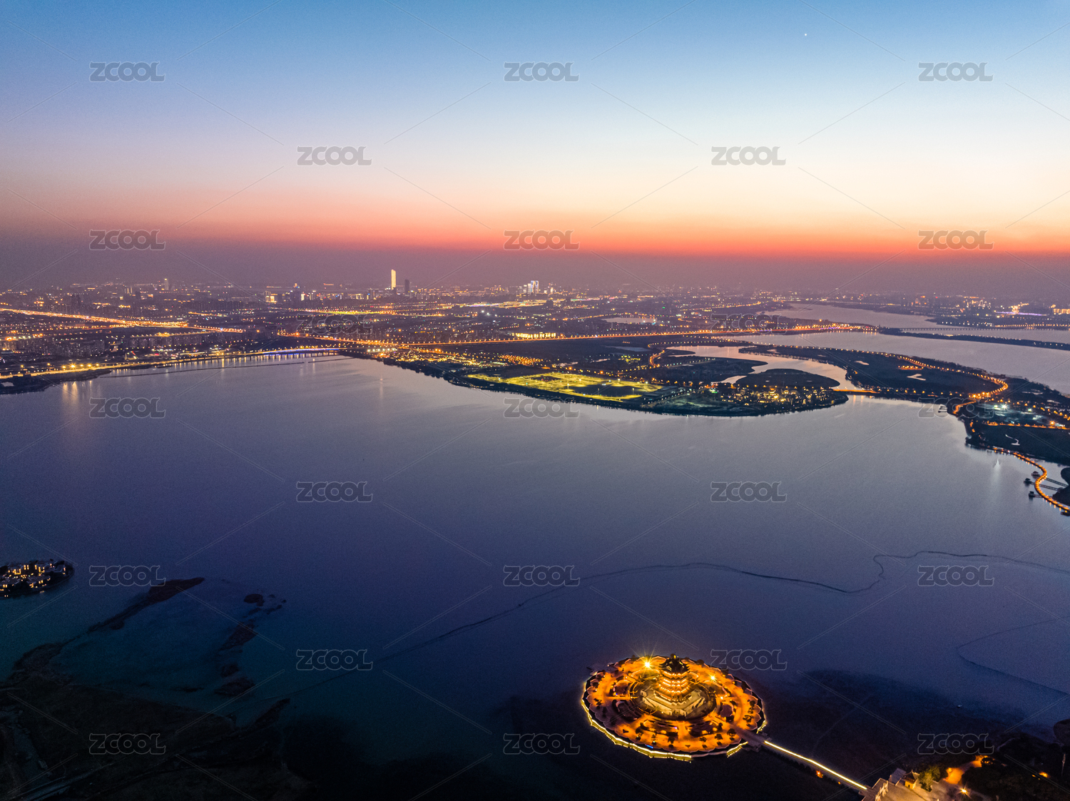 中国江苏苏州阳澄湖傍晚航拍