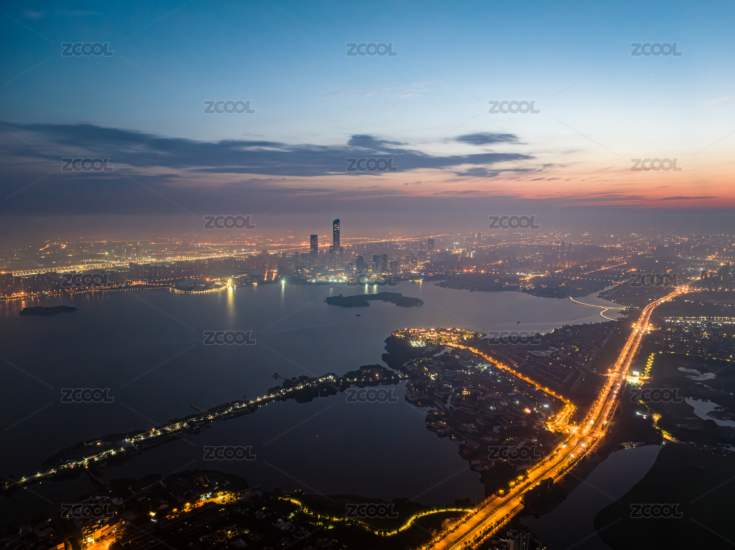 中国江苏苏州独墅湖大道傍晚航拍