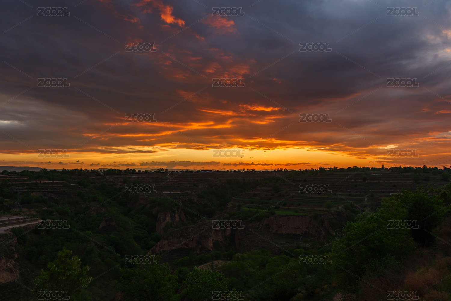黄土高原乡村日落戏剧性的天空晚霞云景