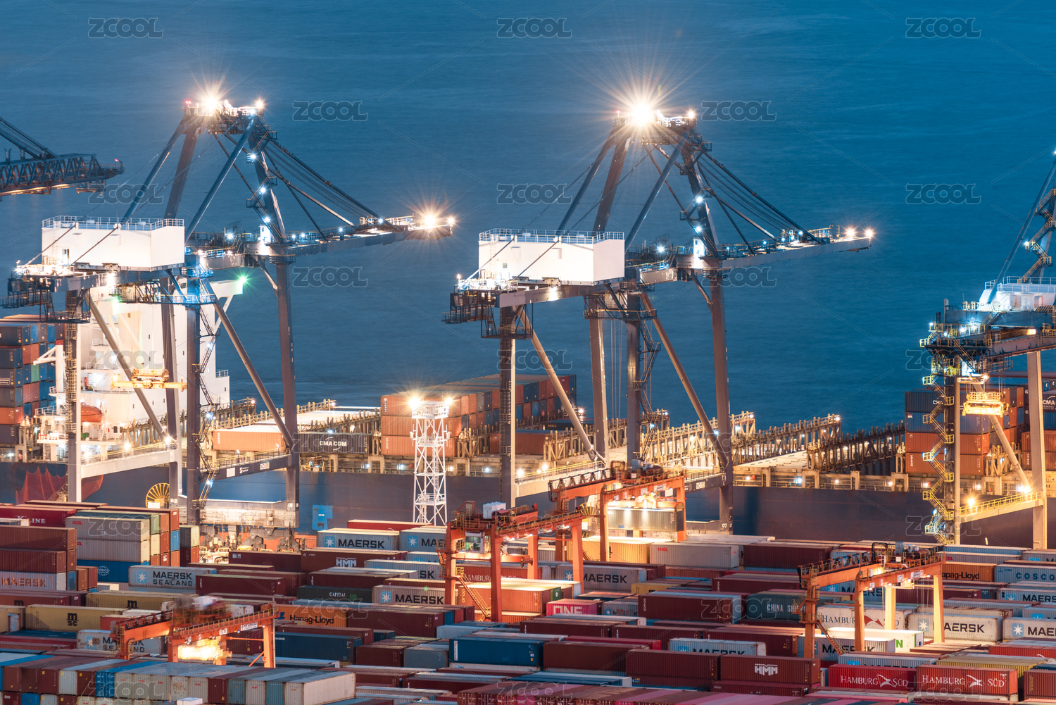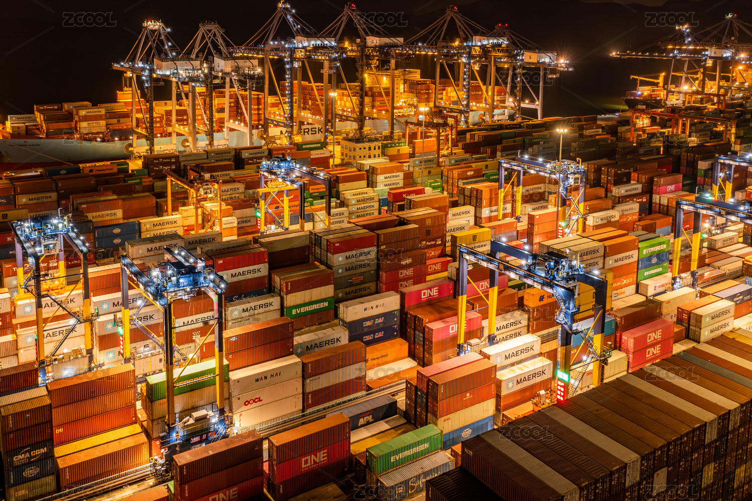 大型集装箱港口堆叠的集装箱和起重机夜景