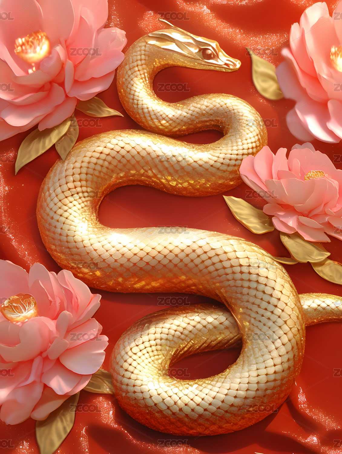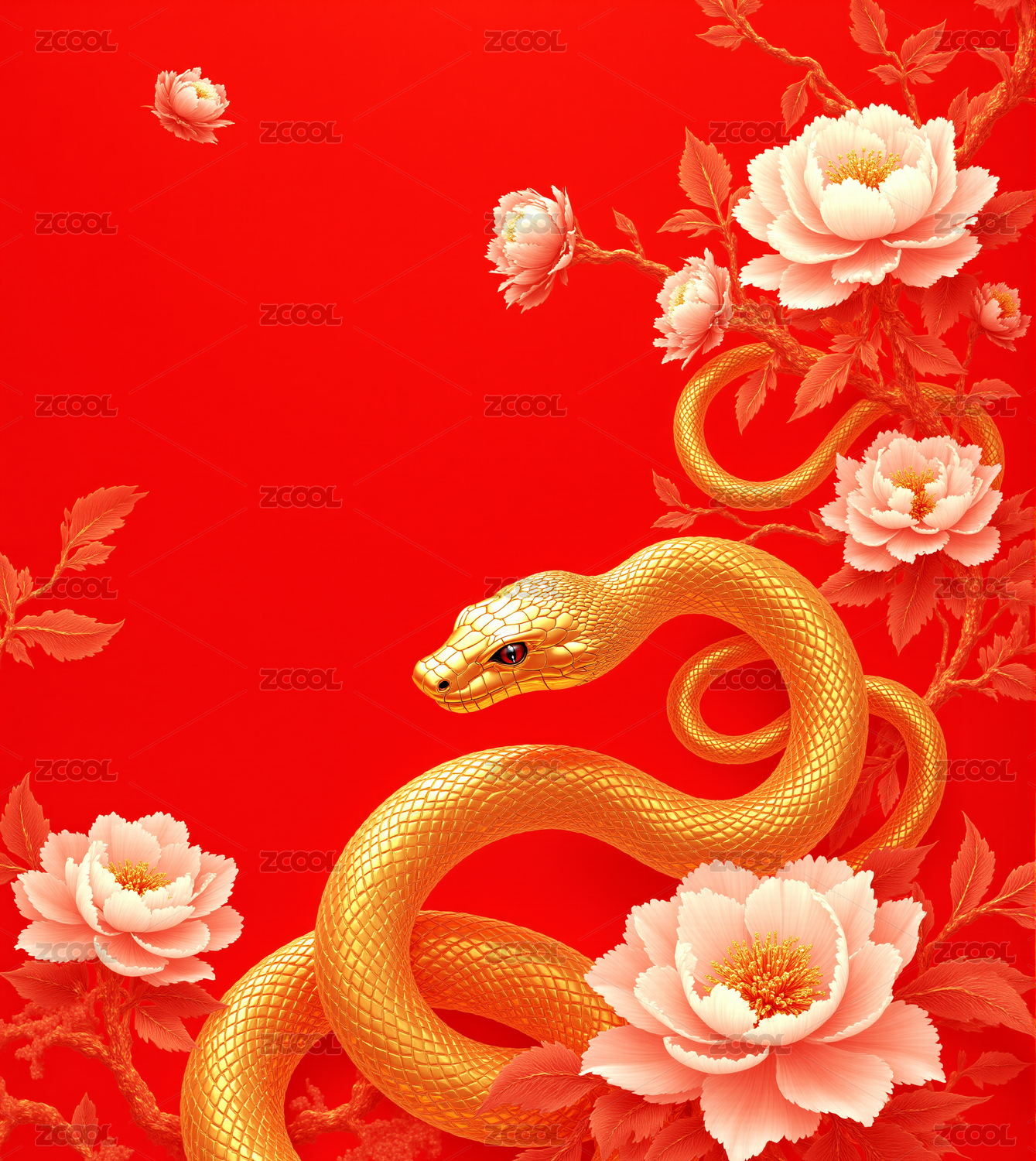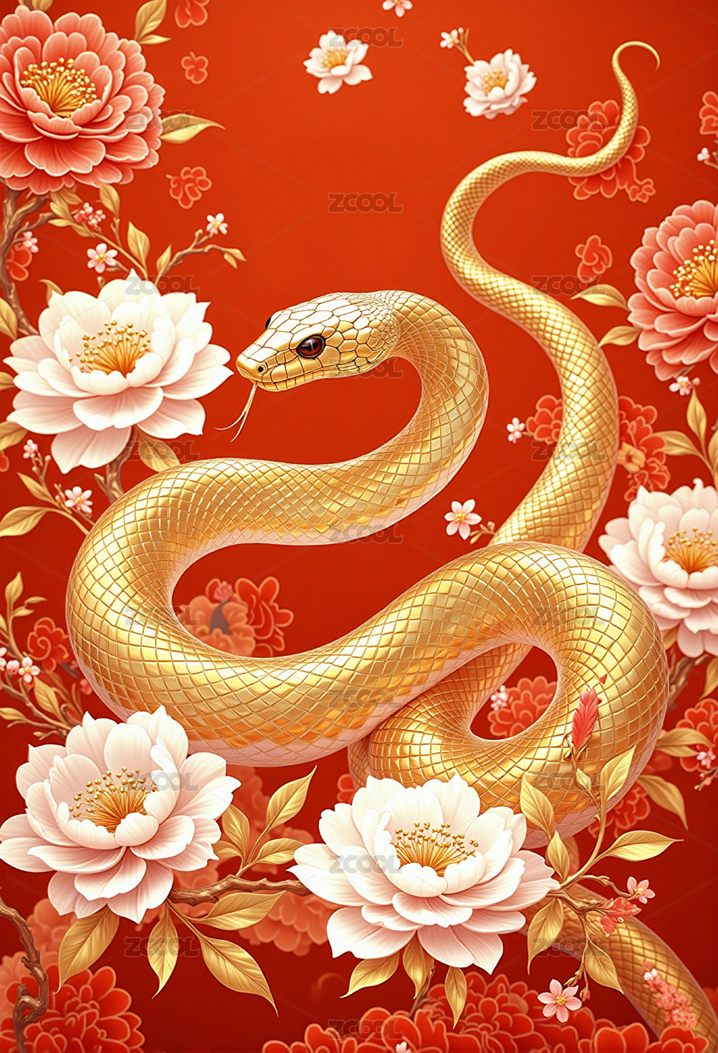 巳蛇年主题的金蛇与花卉