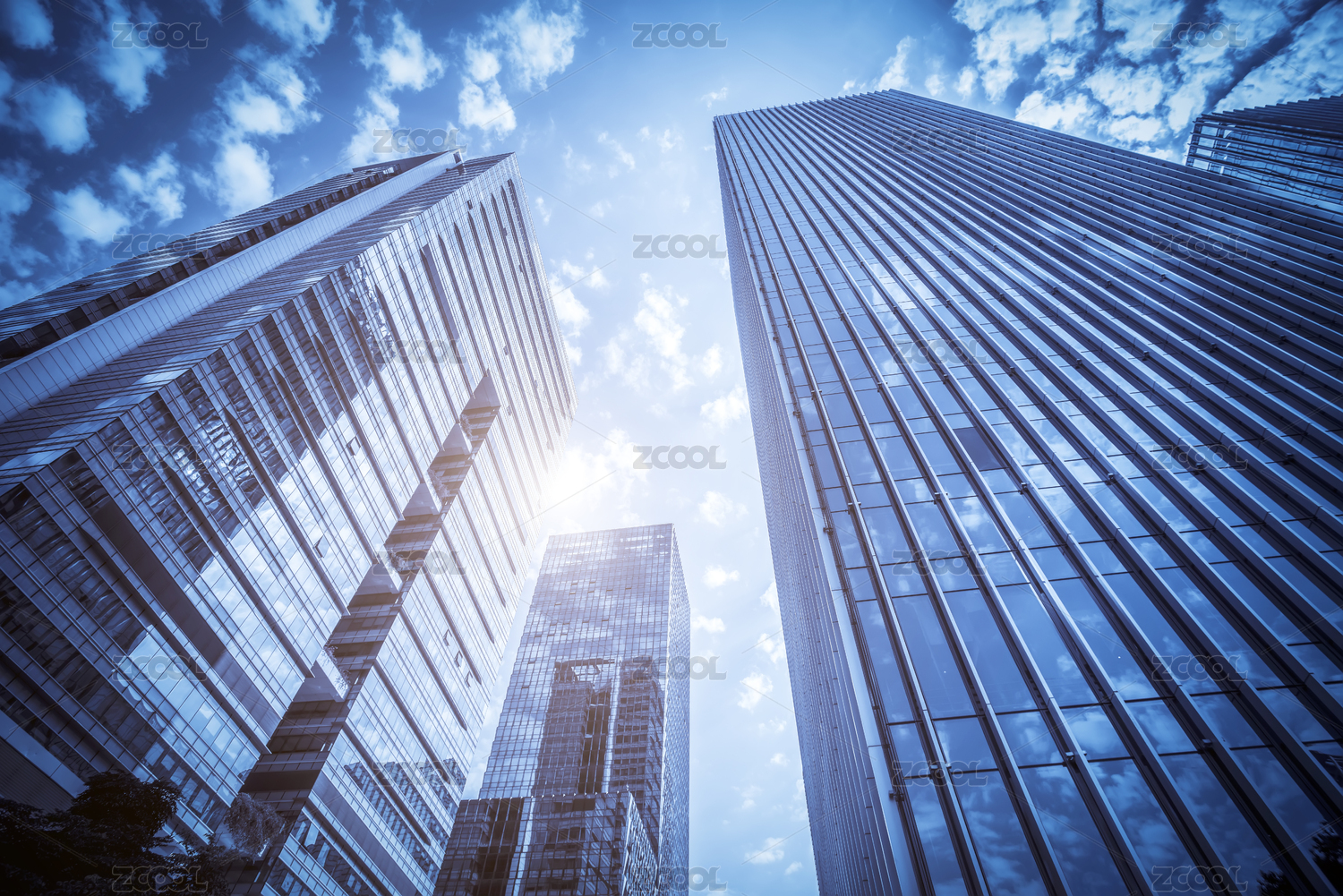 城市建筑,蓝天白云,仰视金属结构高楼大厦的玻璃幕墙,视觉透视聚会到焦点