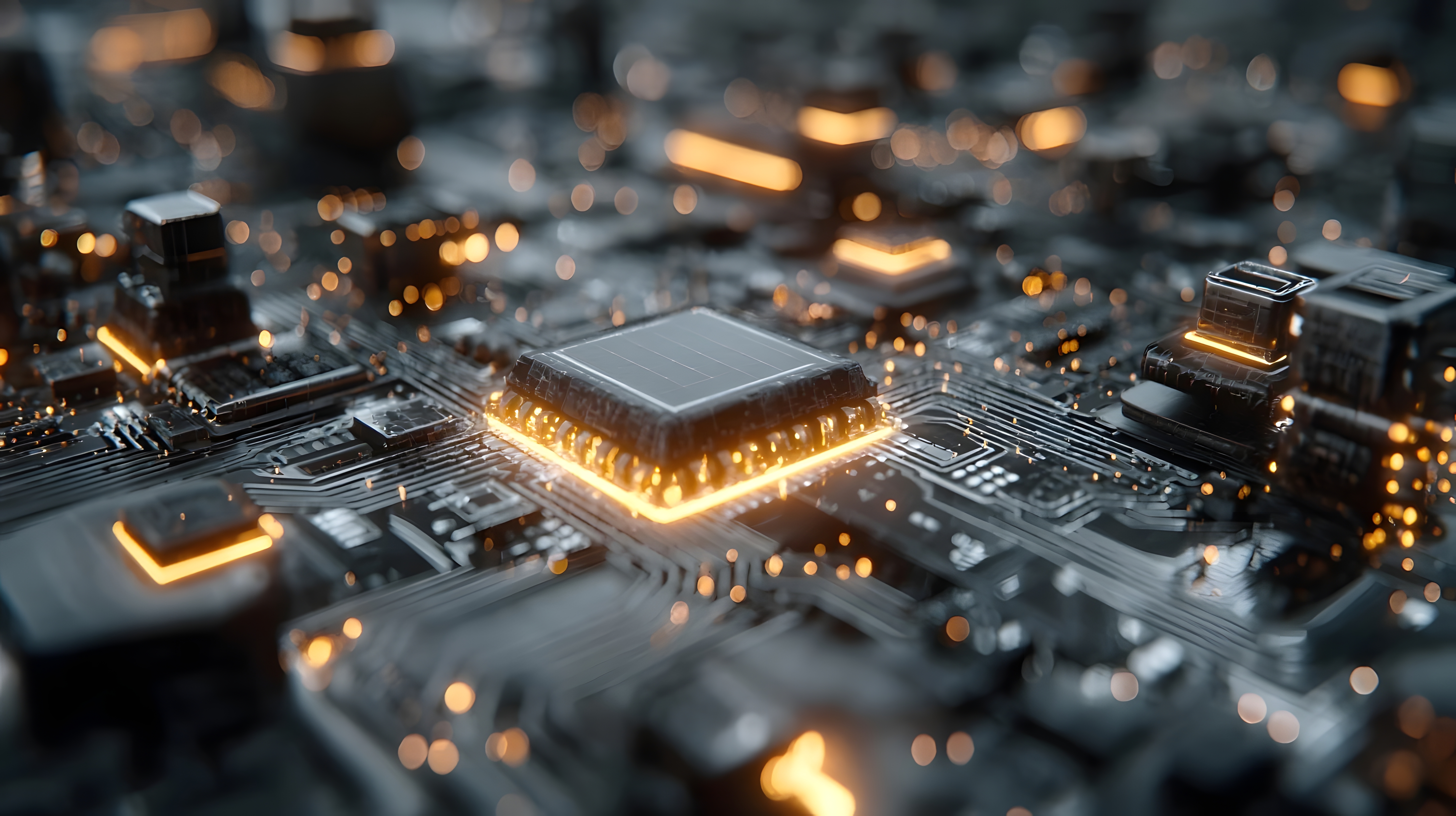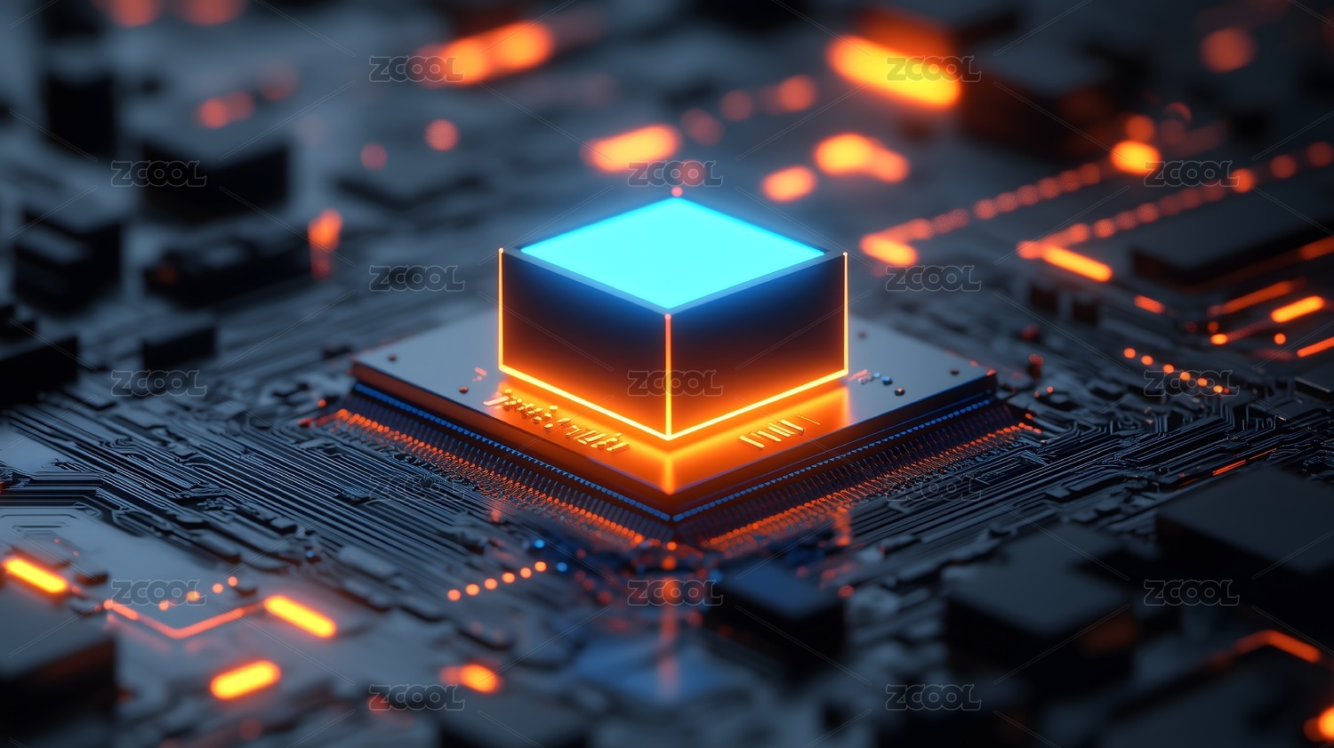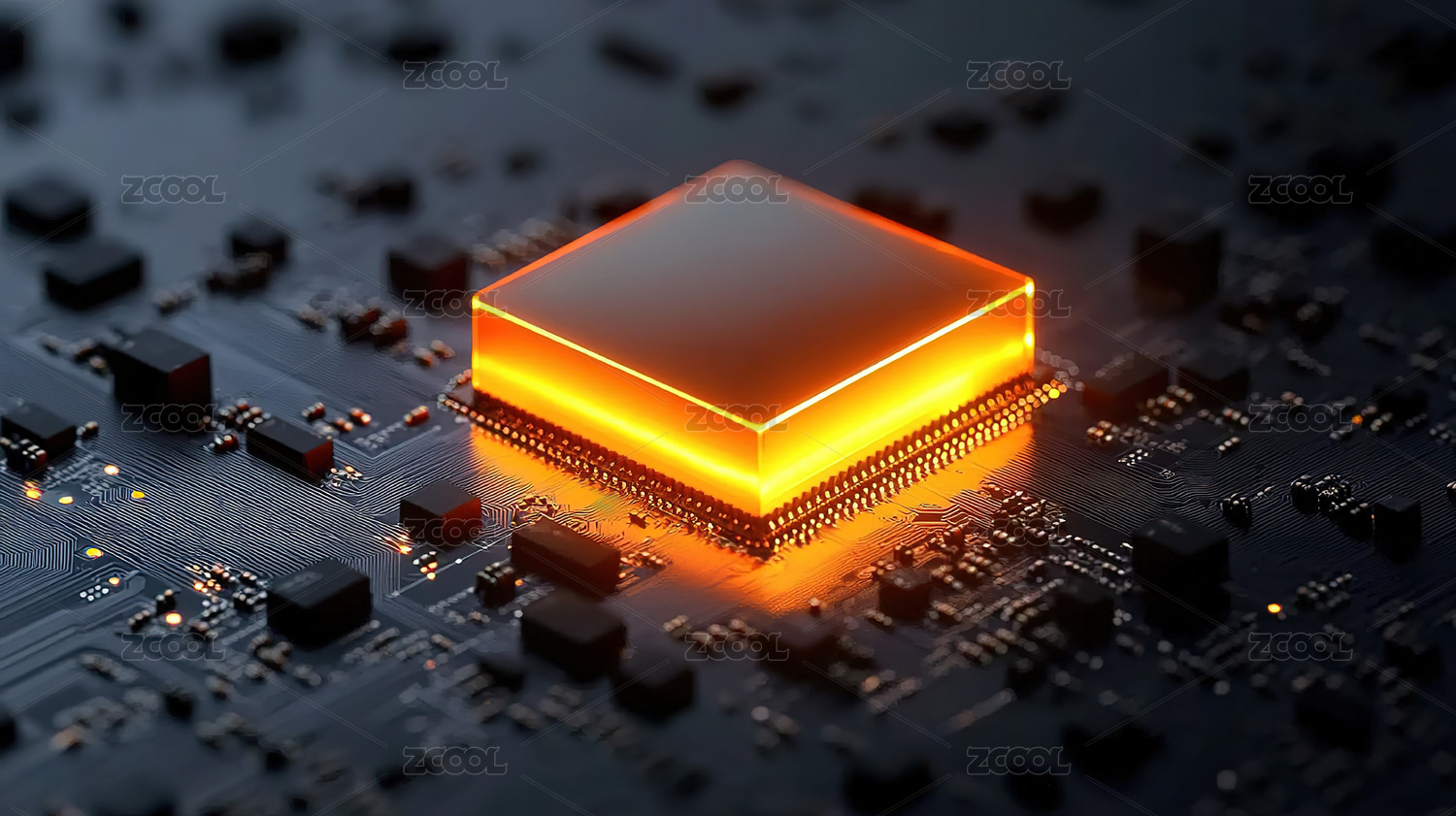 科技感十足的电路板,中心处理器散发光芒