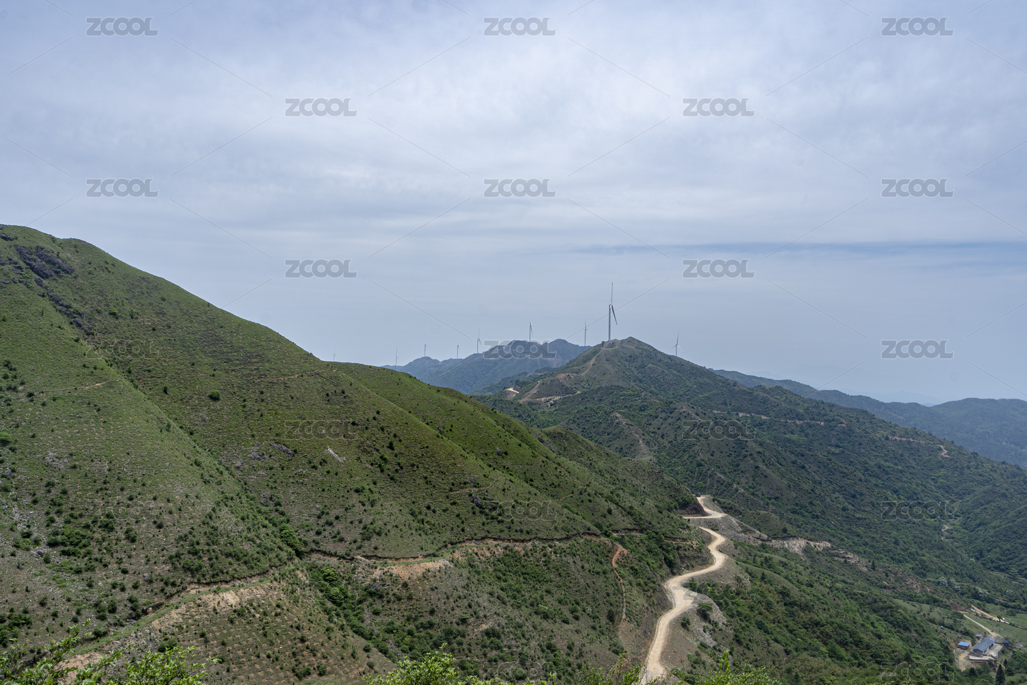 山峰上的风力发电风车组及山区公路