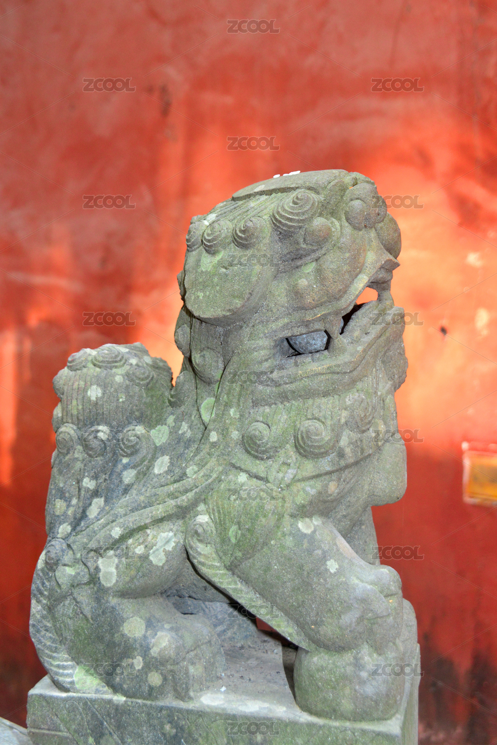红色背景下的青铜狮子