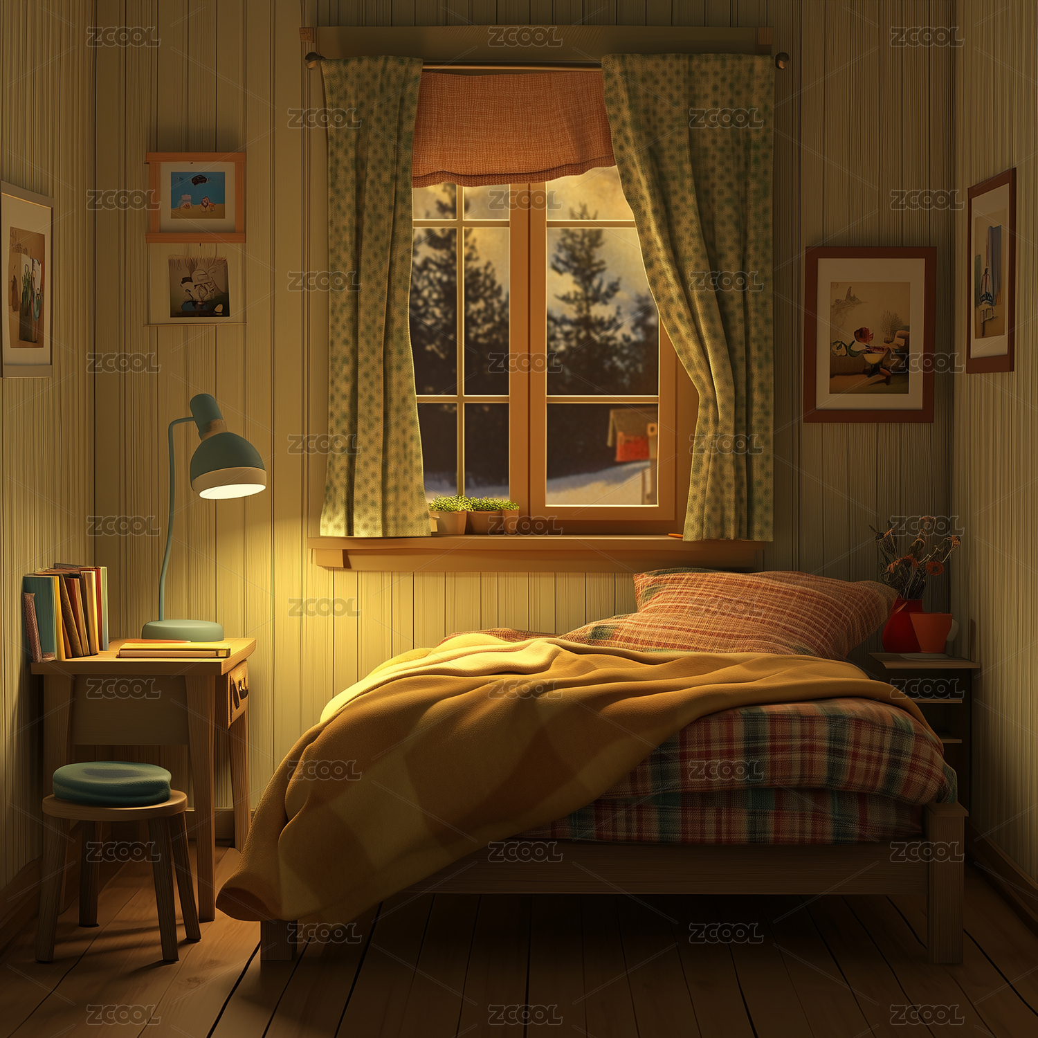 卧室,室内,床,窗户,住宅房间,无人,3D,插画,卡通风格