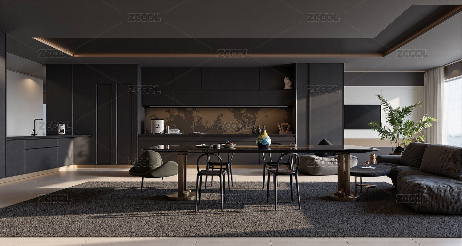 室内,厨房,餐厅,现代,暗调,室内效果图