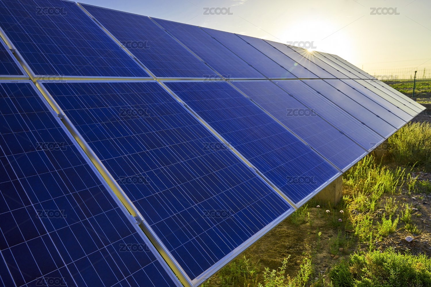 清晨的阳光照射在户外的太阳能光伏区