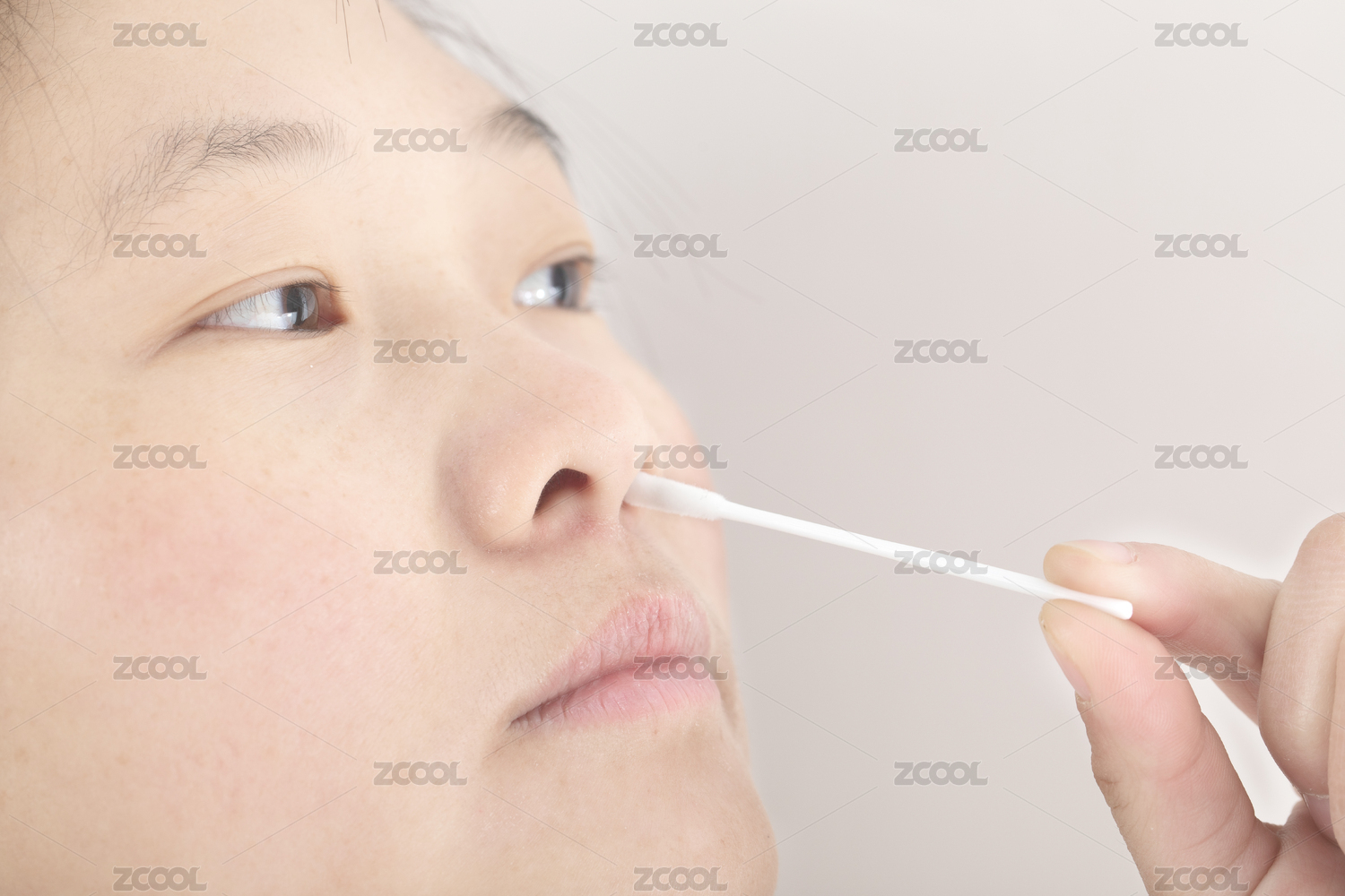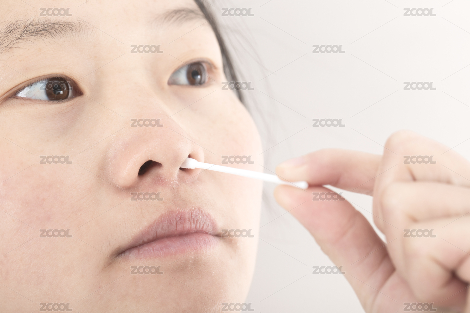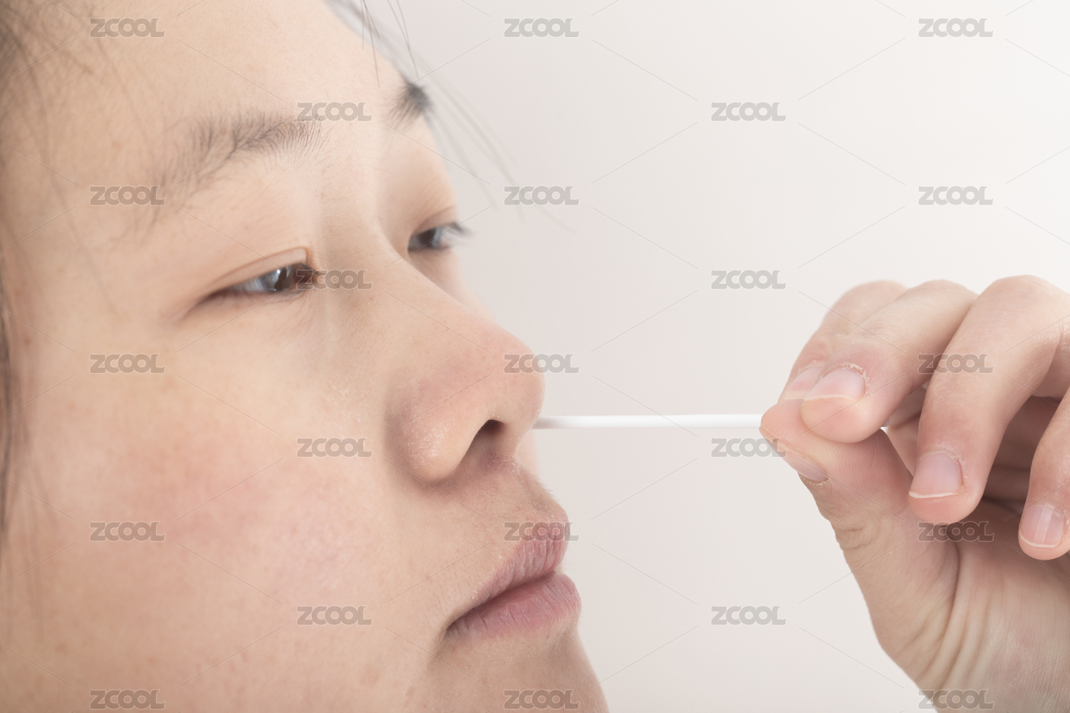 手拿着鼻咽采样拭子对着鼻子采样的女性