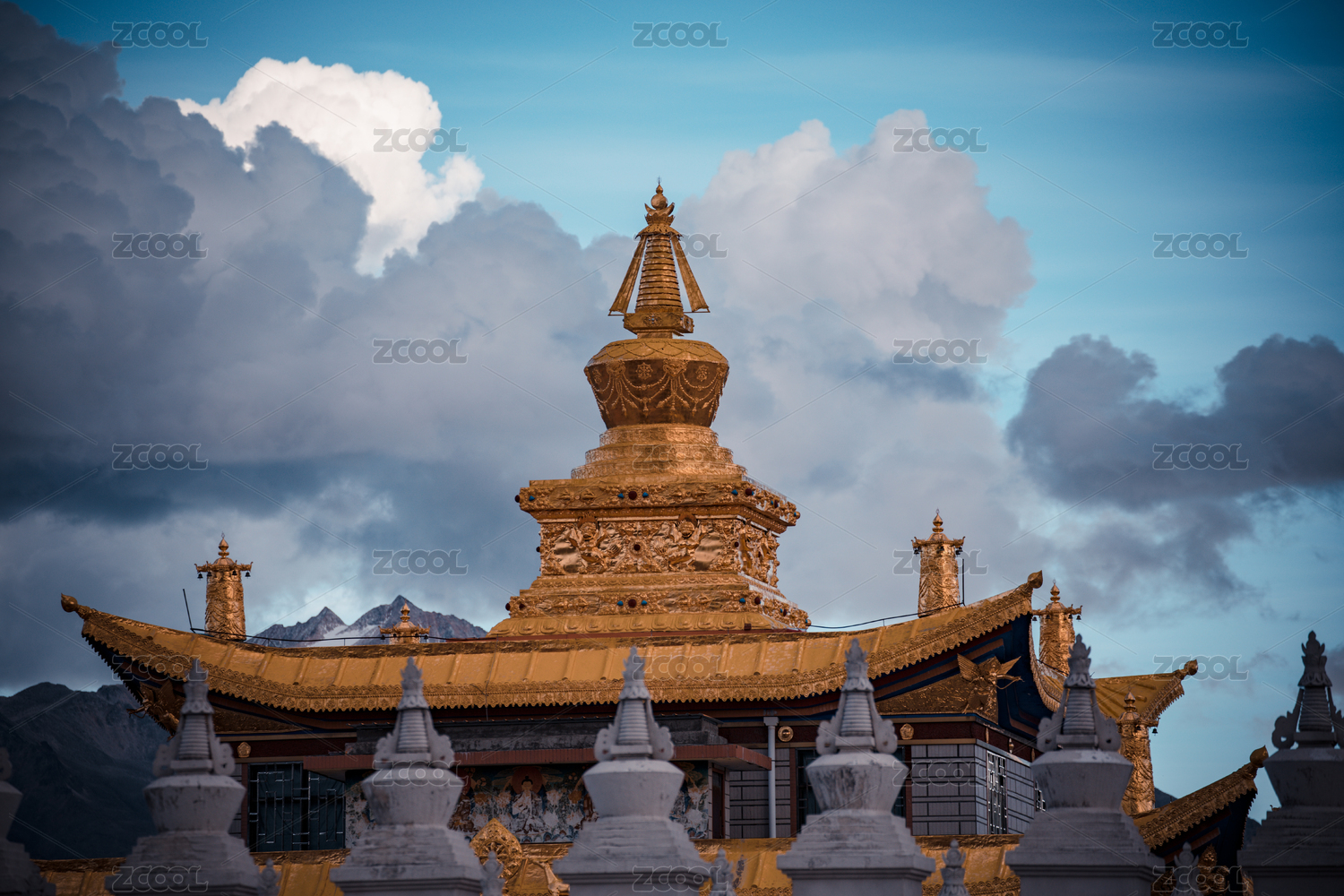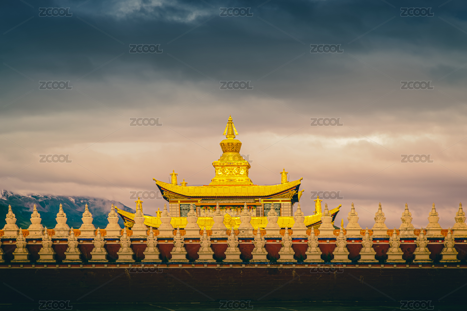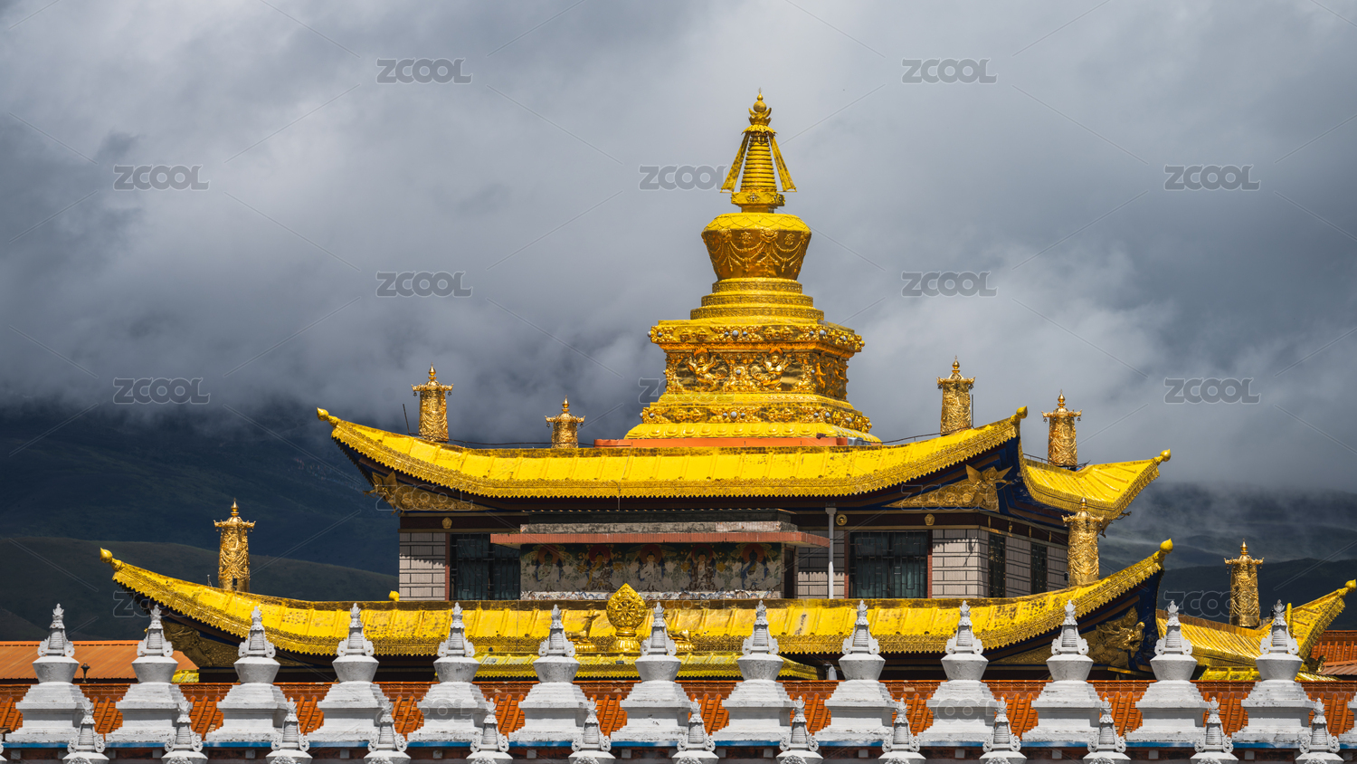 中国四川甘孜乌云下金璧辉煌的塔公寺