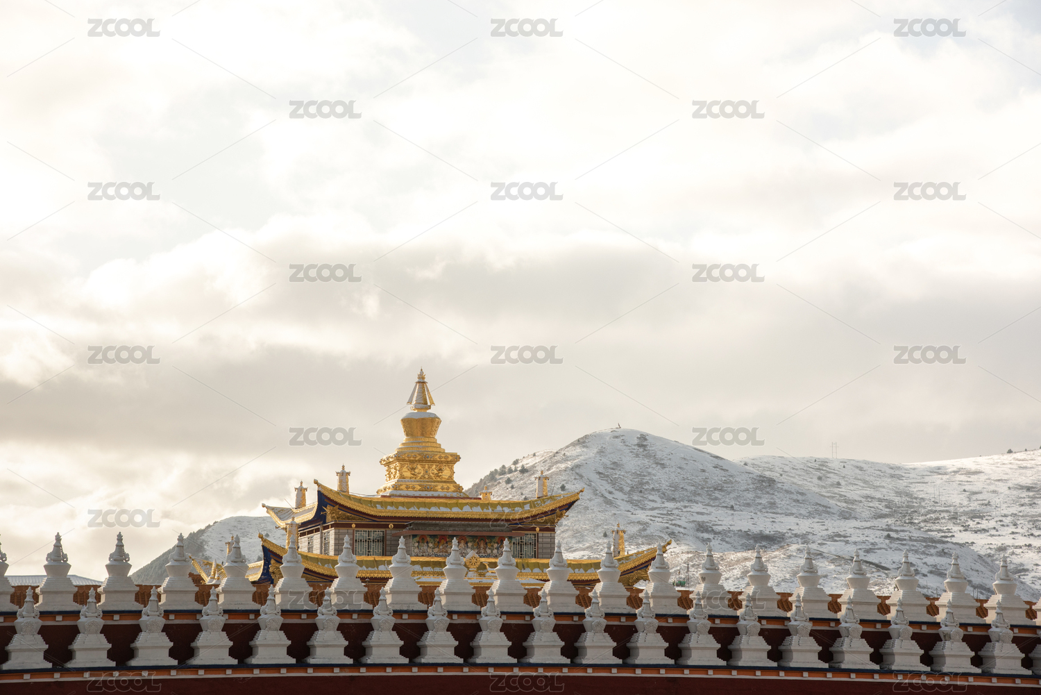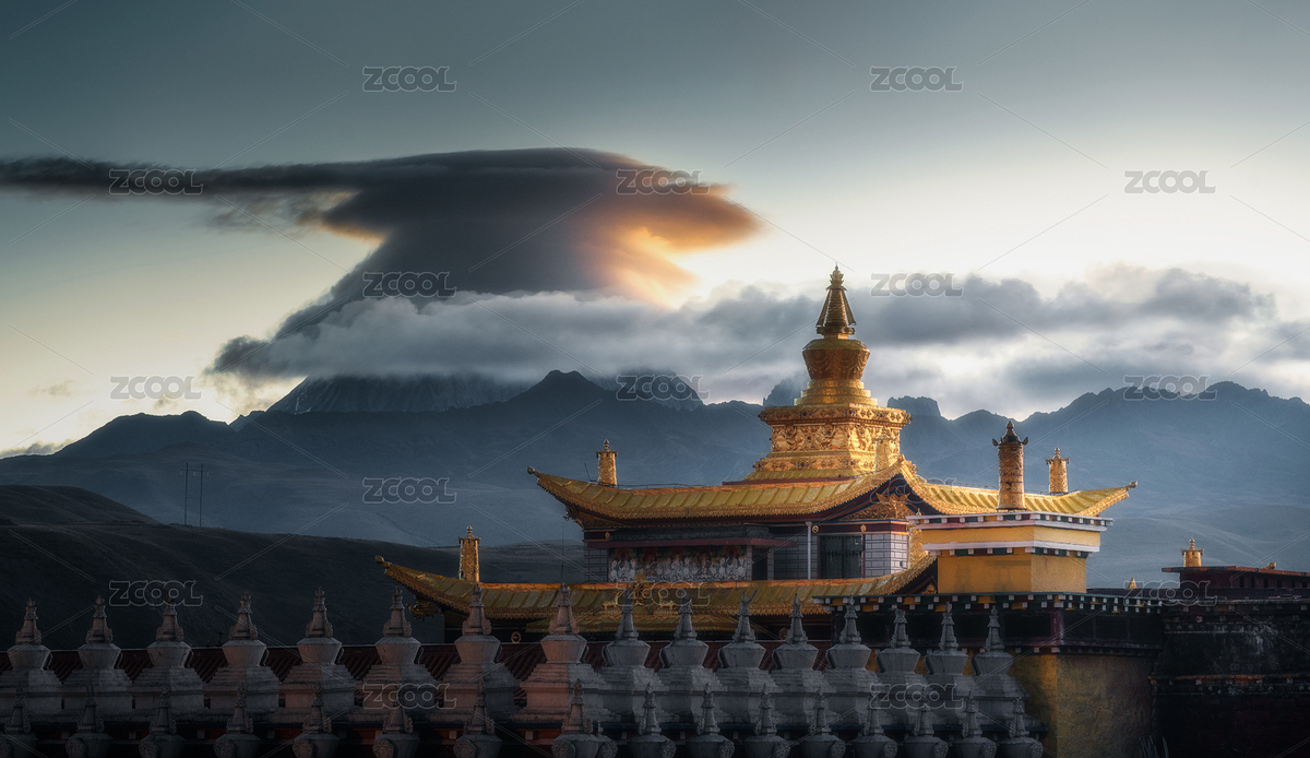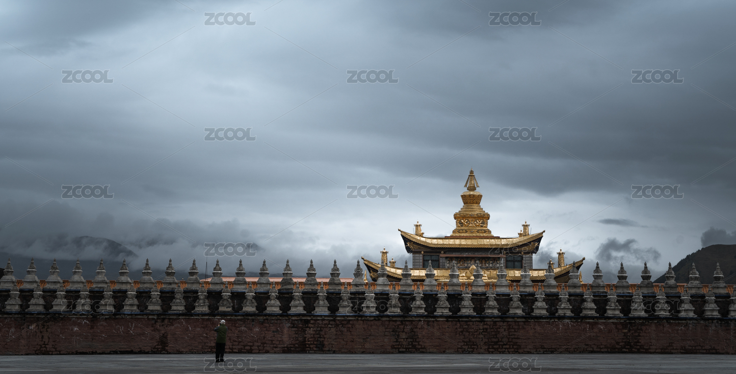 中国四川甘孜乌云下金璧辉煌的塔公寺