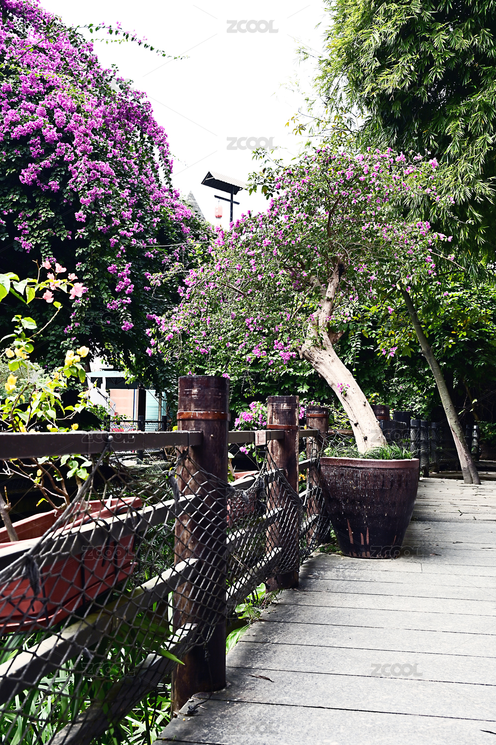 深圳甘坑古镇古房屋顶上的瓦片和三角梅