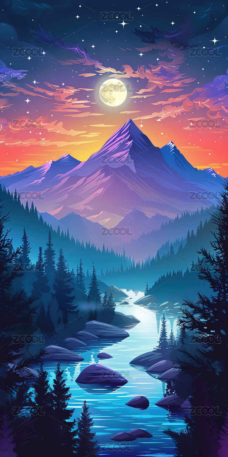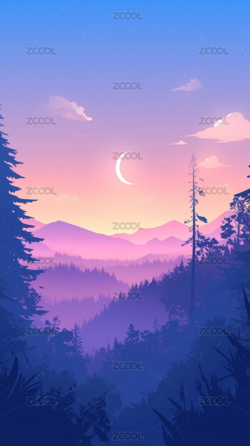 圆月,明亮,团圆,粉色,扁平风,竖屏,山水,湖,森林,平面