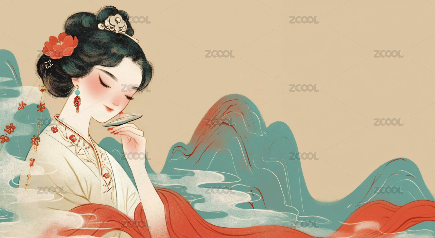 国潮风江山仙女美人中秋嫦娥品茶创意插画