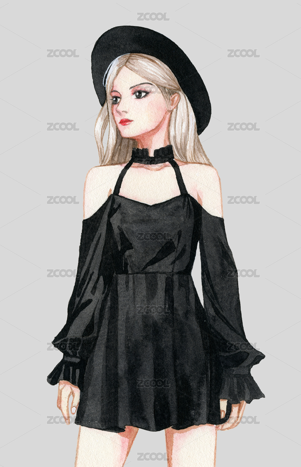 穿着黑色吊带的白发时尚少女 水彩手绘插画