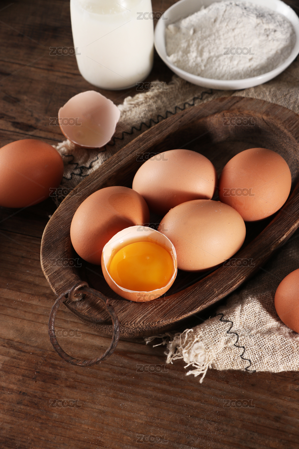 原木桌子上放着一盘新鲜红皮鸡蛋展现出蛋黄蛋液