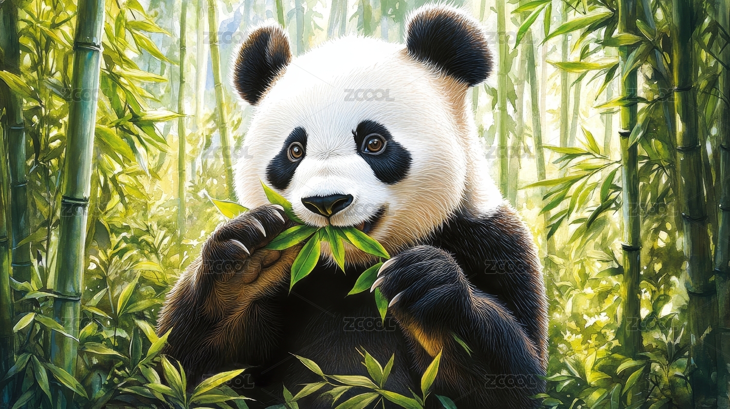 水墨插画风中国国宝吉祥物熊猫拿着竹子微笑