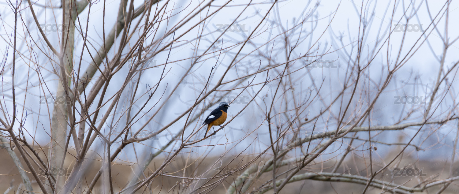一只红协蓝尾鸲鸟在灌木林间鸣叫觅食