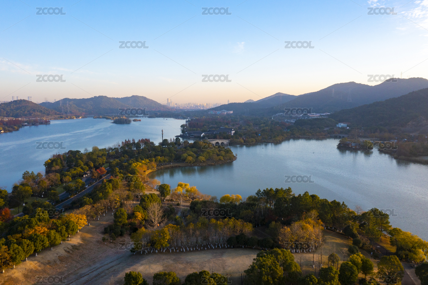 浙江省杭州市湘湖景区秋色晨曦航拍