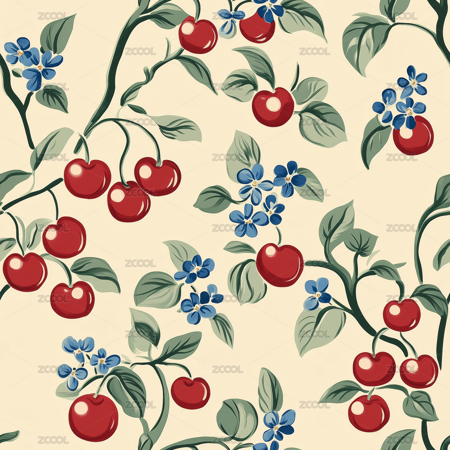 车厘子花卉四方连续无缝图案